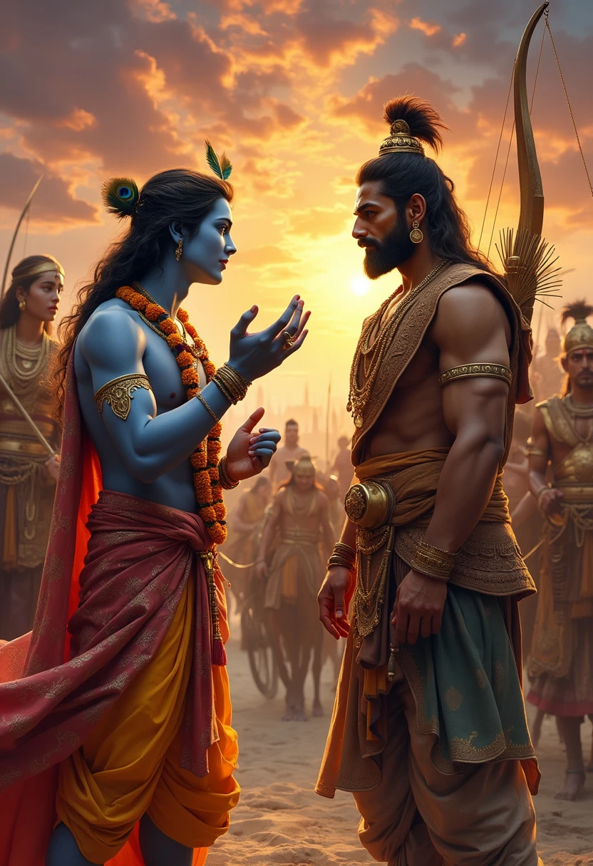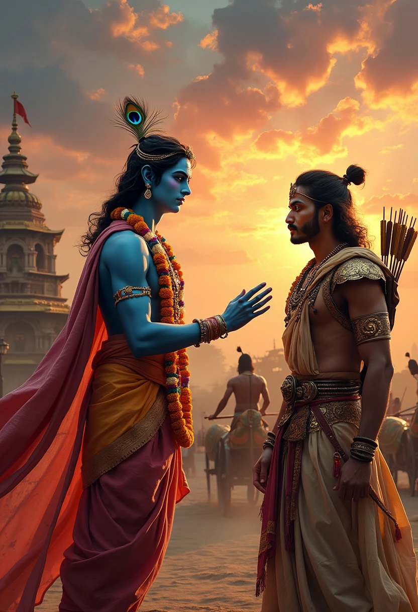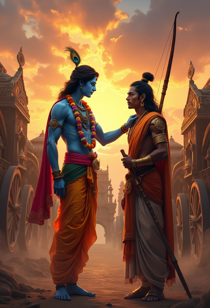Create a highly realistic and dramatic image depicting Lord Krishna interacting with Arjuna in front of ancient chariots. The scene is set in a warm, epic sky with a dramatic blend of oranges, reds, and purples, reminiscent of the atmosphere during a significant moment of the Ramayana. Details: Lord Krishna: Portray Krishna with a serene and wise expression. He is dressed in traditional attire with a rich, multi-colored dhoti and a garland of flowers. His skin is a deep, divine blue. Krishna should be depicted in a dynamic, engaging pose, possibly with one hand raised in a gesture of counsel or blessing. His hair should be adorned with a peacock feather. Arjuna: Show Arjuna in his warrior attire, with a look of intense focus or contemplation, reflecting his internal struggle. He is dressed in ornate armor and holding his bow (Gandiva) with a quiver of arrows. Chariots: Position the chariots prominently in the background. They should be intricately designed with detailed carvings and embellishments, reflecting the grandeur of the era. Epic Sky: The sky should be a blend of warm, dramatic colors, with clouds painted in vivid hues of orange, red, and purple, creating a celestial backdrop. Setting: The overall mood should evoke the epic and heroic atmosphere of a pivotal moment in the Ramayana. Include hints of an ancient battlefield or sacred ground in the backdrop. The composition should highlight the interaction between Krishna and Arjuna as a moment of profound guidance and spiritual significance, with the epic sky adding to the grandeur and intensity of the scene.