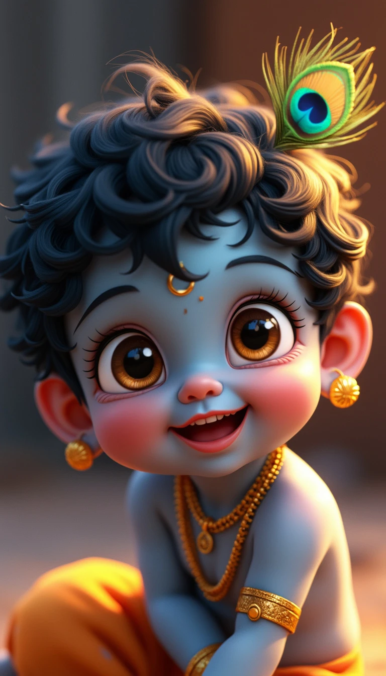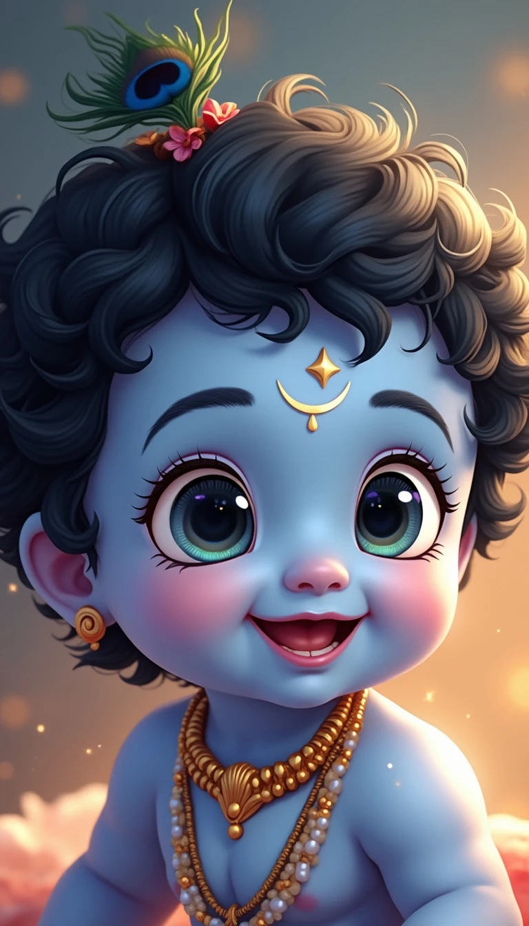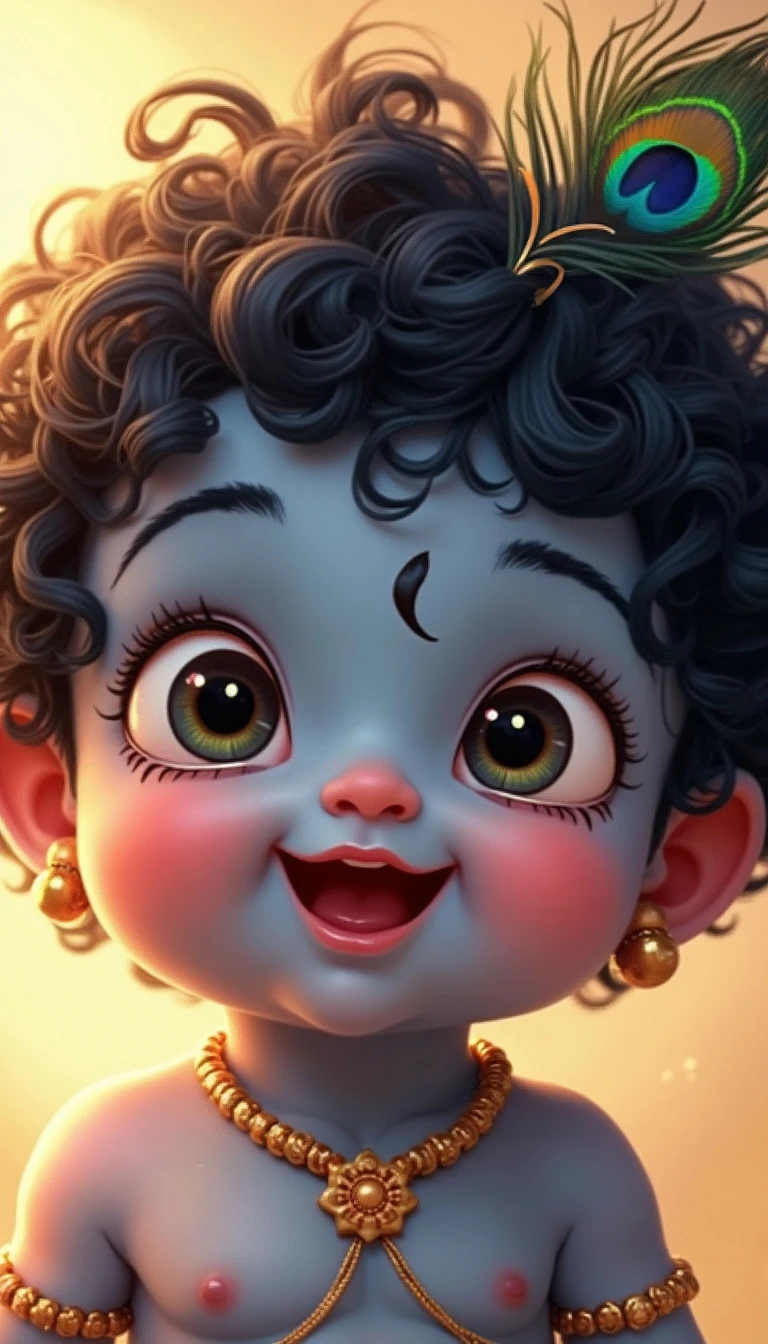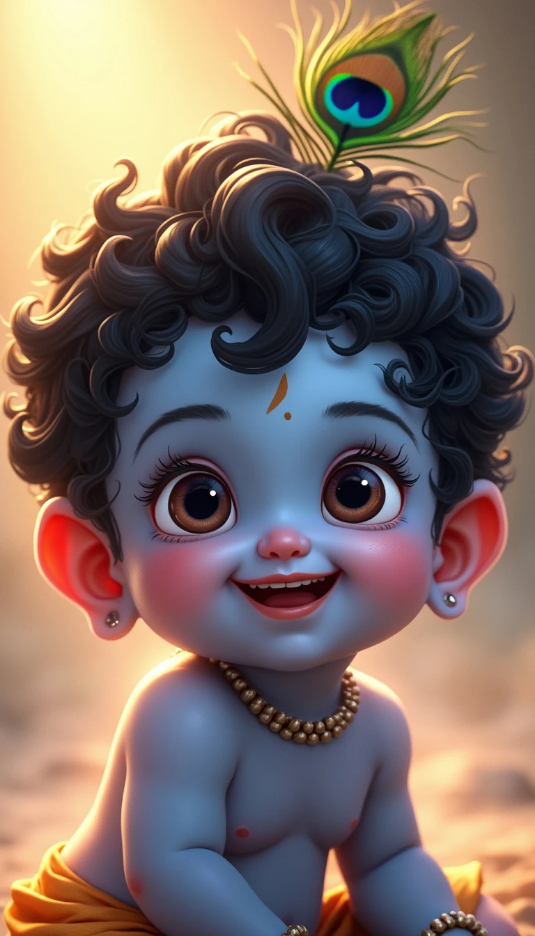 A close-up face portrait of baby Krishna, around 1 year old. He has soft, chubby cheeks and big, innocent eyes that sparkle with mischief. His skin is a gentle blue hue, glowing with a divine aura. He has curly black hair, with a small tuft on top, adorned with a tiny peacock feather. His expression is joyful, with a hint of a playful smile. The background is simple, with soft, warm light that enhances the innocence and purity of baby Krishna.