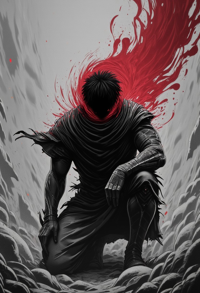 Monochrome with red color Highlights, greyscale, Highly detailed photorealistic, man, m100-style, floating dust particles, Action Scene, Motion lines, kneeling, warrior with Colorful Planet hat, Male Focus,