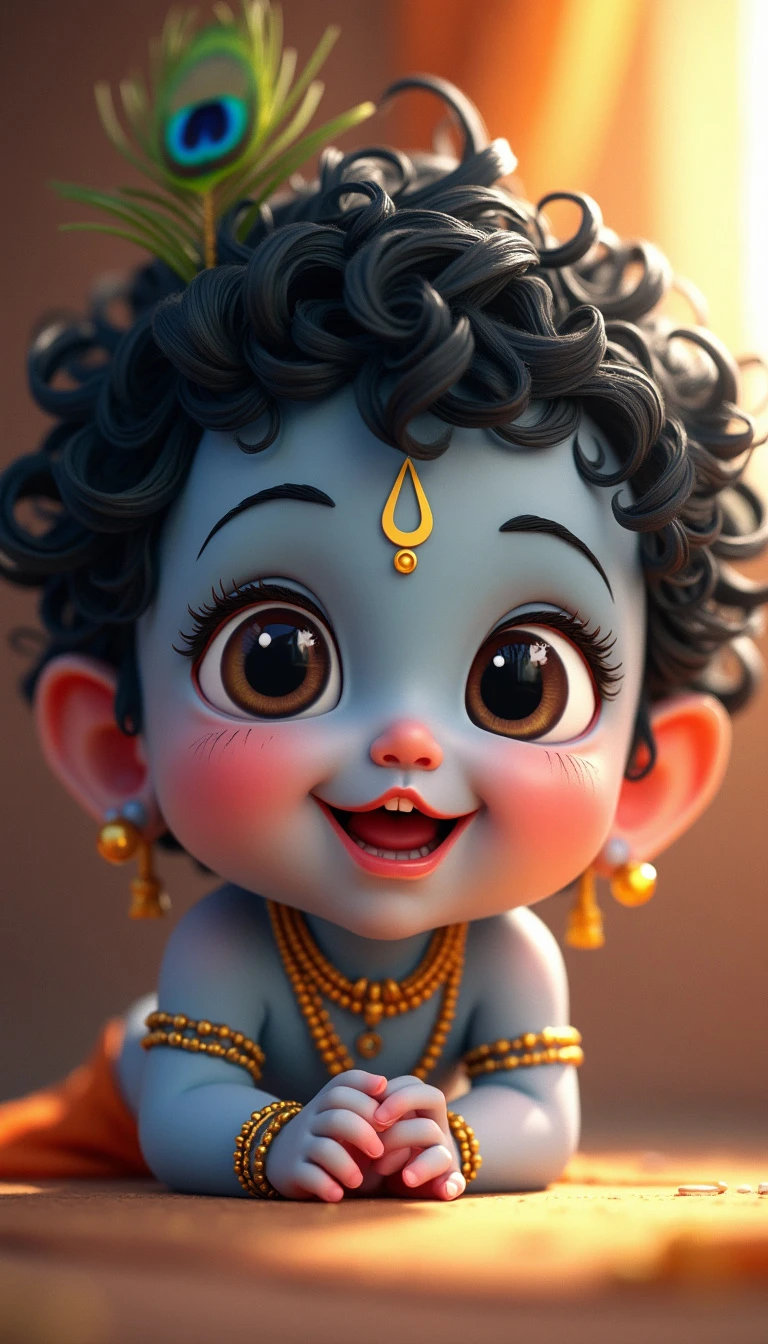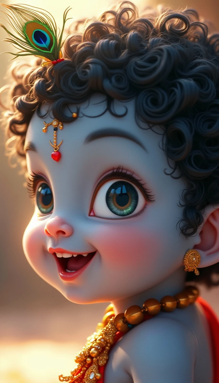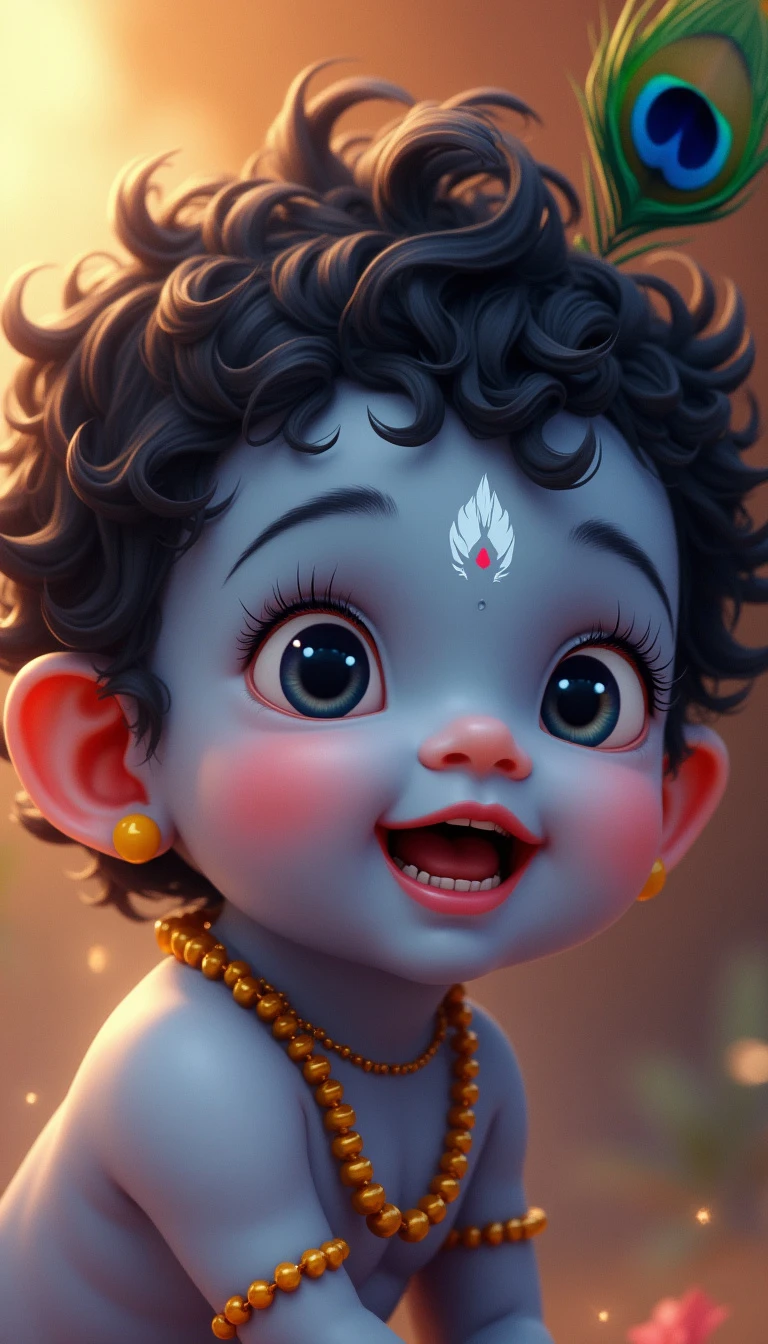 A close-up face portrait of baby Krishna, around 1 year old. He has soft, chubby cheeks and big, innocent eyes that sparkle with mischief. His skin is a gentle blue hue, glowing with a divine aura. He has curly black hair, with a small tuft on top, adorned with a tiny peacock feather. His expression is joyful, with a hint of a playful smile. The background is simple, with soft, warm light that enhances the innocence and purity of baby Krishna.