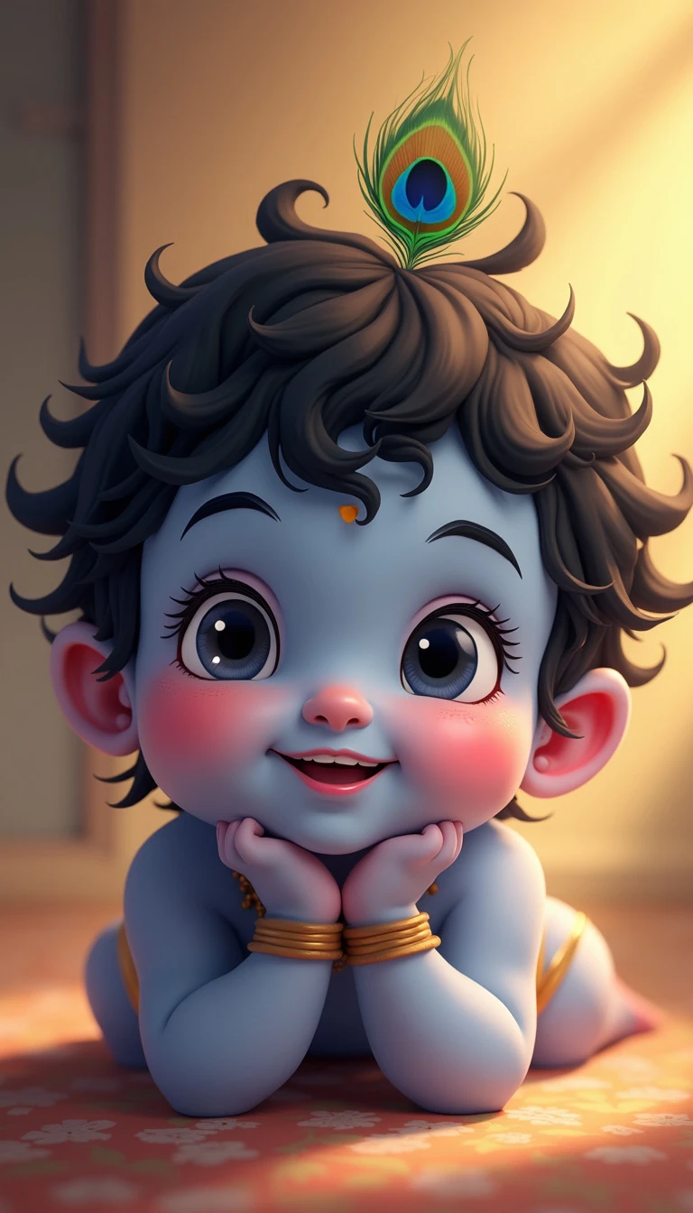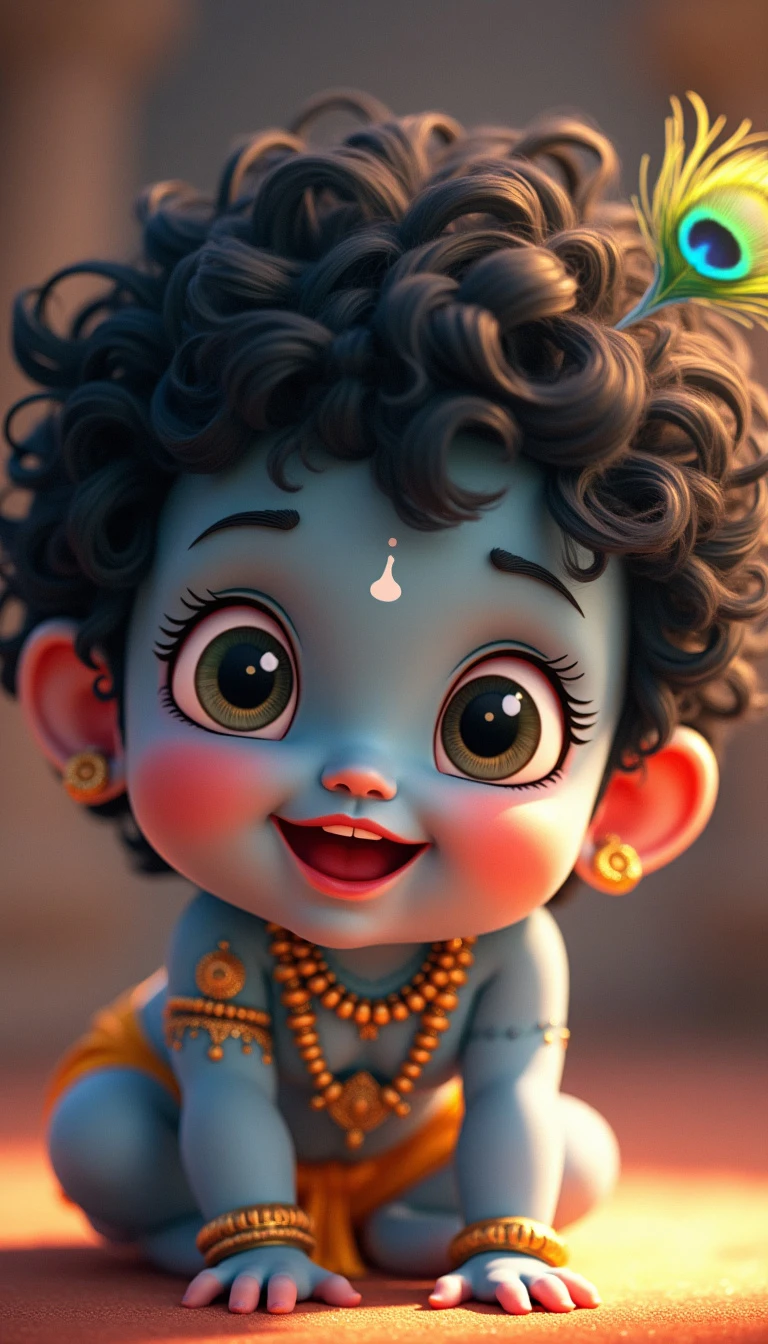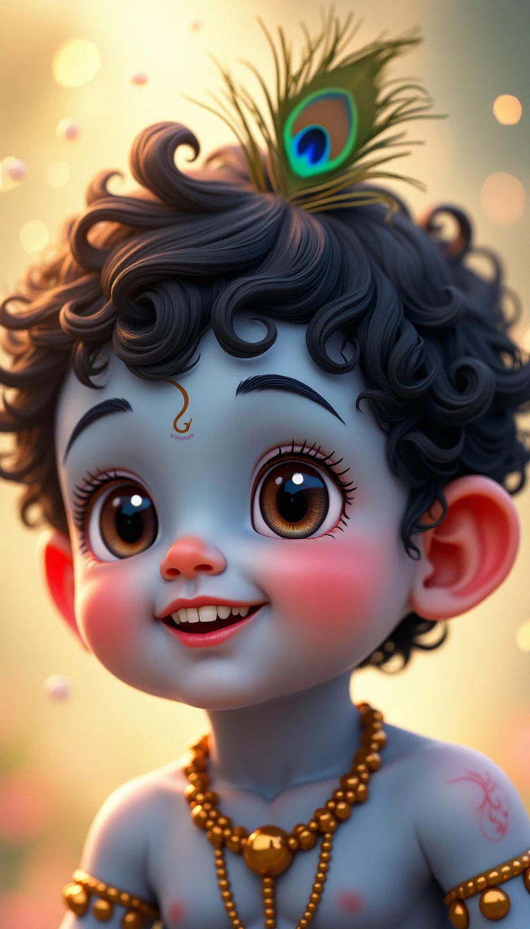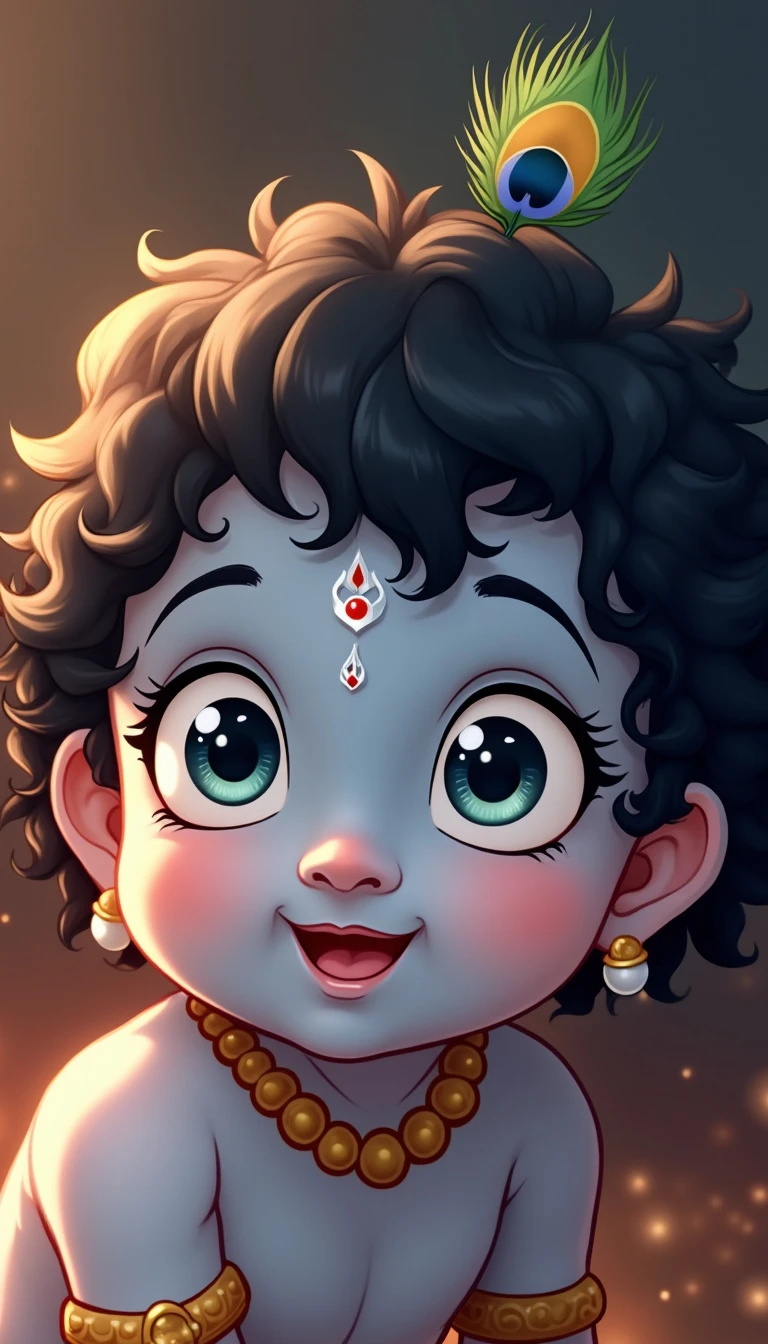 A close-up face portrait of baby Krishna, around 1 year old. He has soft, chubby cheeks and big, innocent eyes that sparkle with mischief. His skin is a gentle blue hue, glowing with a divine aura. He has curly black hair, with a small tuft on top, adorned with a tiny peacock feather. His expression is joyful, with a hint of a playful smile. The background is simple, with soft, warm light that enhances the innocence and purity of baby Krishna.