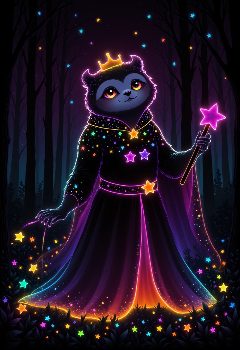neon outline on black, neon colors,A cute sloth king with magic robe and magic staff in a magical forest,