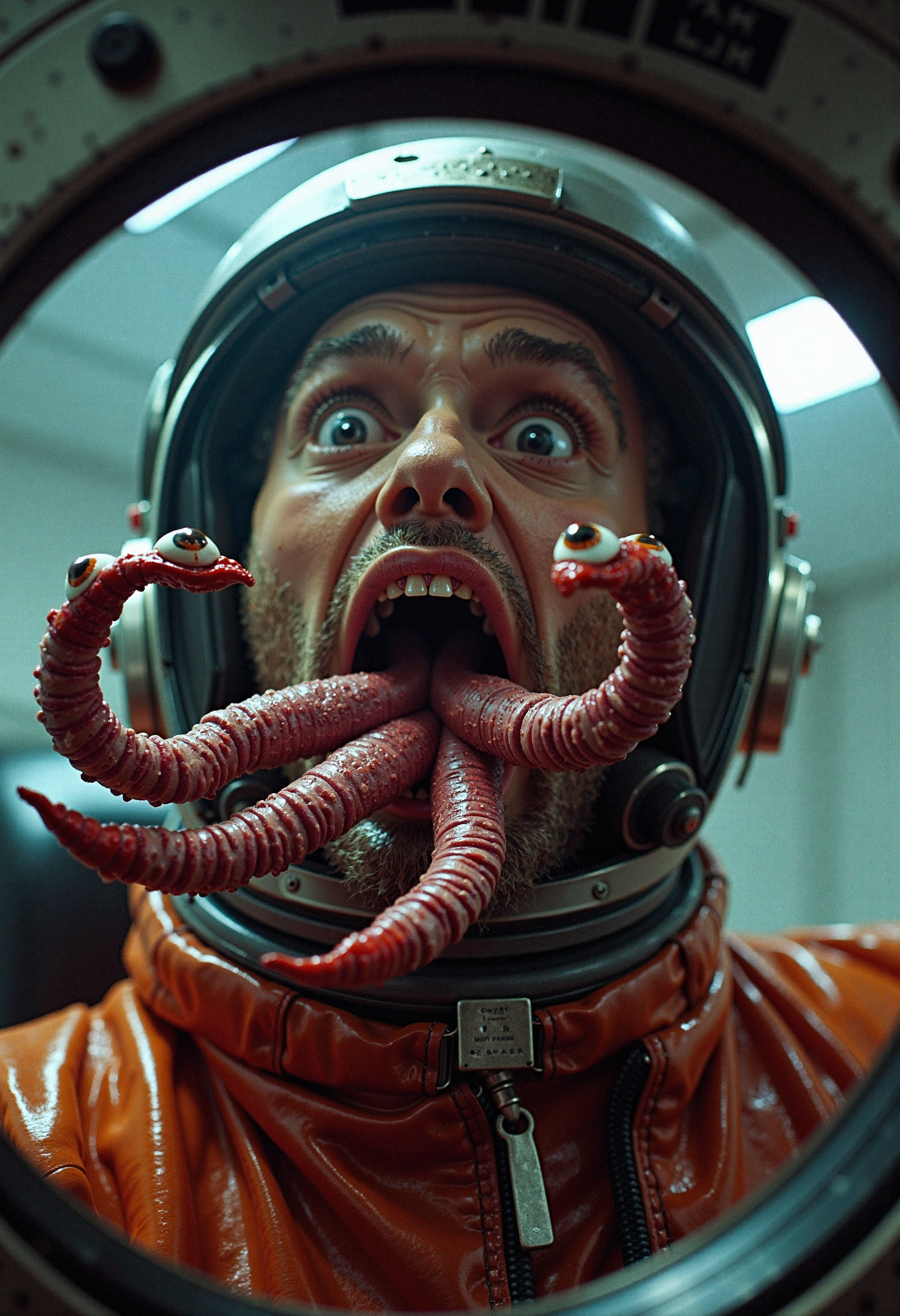 A highly detailed and intricate image of a man in a retro sci-fi flight suit with a shocked expression with a monstrous multiple bifurcating tongue that is covered in warts and on each bifurcation tipped with a detailed bloodshot eyeball, the tongue is contorted as it looks for something. He is inside the cockpit of a spacecraft, with harsh, eerie lighting casting shadows. grotesque, terrifying, chilling, atmospheric composition. <lora:alienset_flux_v1:0.8> ohwx set design <lora:fx-monsters-flux-meatsack:0.4> fx-monsters-flux-meatsack