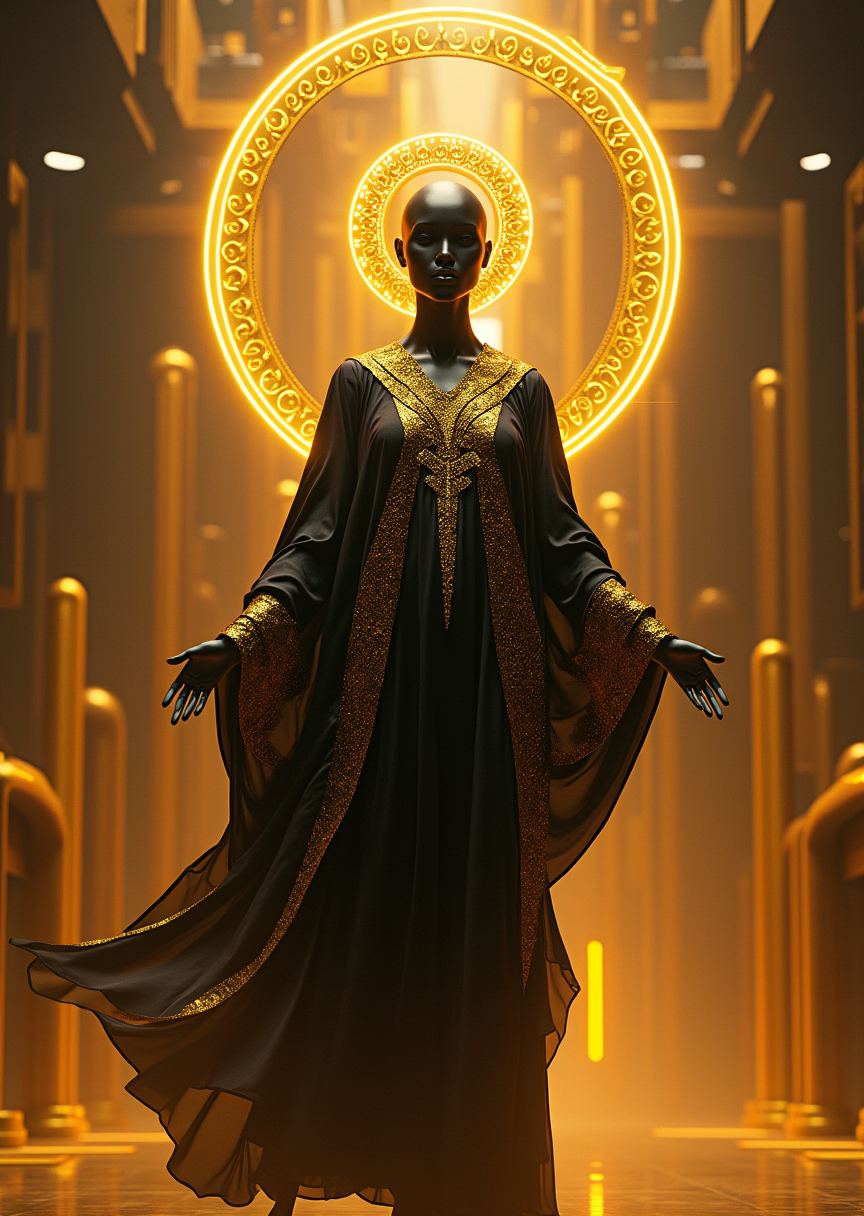 a futuristic, divine figure floating in a glowing, high-tech environment. The figure is draped in flowing robes that shimmer with metallic gold highlights. It has a dark, featureless face, made of a reflective or matte material, contrasting with the ornate and illuminated attire. A large, circular halo-like structure surrounds the head, with additional golden elements radiating from it, adding to the figure's ethereal and majestic presence. The background consists of abstract, golden architectural elements, giving the scene a surreal, otherworldly feel. The overall color palette is dominated by warm golds and blacks, creating a dramatic and mystical atmosphere.