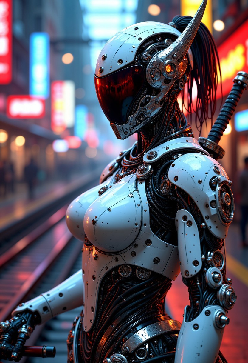 mythp0rt, cyberpunk robot samurai woman, robot face with mirrored face shield, hyperdetailed helmet, white and neon armor, robot joints, body made of metals, cables and wires, holding a katana by the hilt, cyberpunk railway platform, neon signs, bokeh
