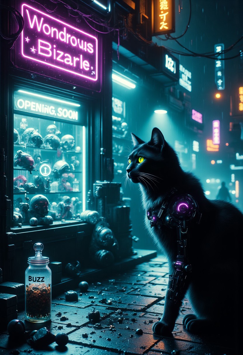 In the distance, a black cat with long fur and glowing neon green eyes sits in a shop window. The cat has cybernetic prosthetic limbs that shine with a metallic glow. The scene is set in a back alley, lit by rich blue, teal, and purple lights, creating a mysterious and dreamlike atmosphere. The shop, named "The Wondrous Bizarre," has a sign above the door, and another sign on the door reads "Opening Soon." The cat’s bright eyes draw attention to the shop. Next to the shop door, there is a clear jar labeled "Buzz." Inside the shop, strange and otherworldly prosthetic parts are visible. The entire scene is detailed and filled with an eerie, mystical vibe.