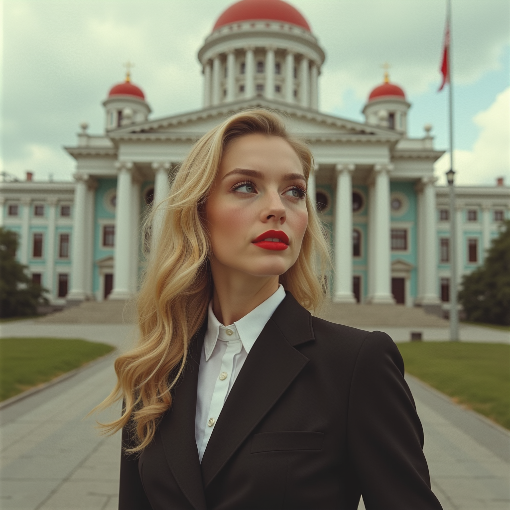 soviet poster , Young Russian Women in her 20s, blonde hair, red lipstick, formal attire, standing out a soviet goverment building, cloudy, day time, looking to the side, masterpiece, high quality, best quality, full shot, full body,