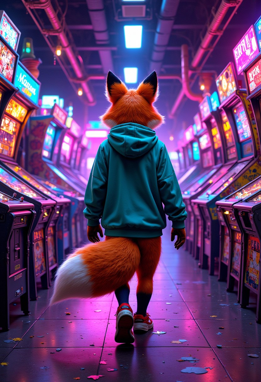 Neon splash art of an anthro fox wearing a teal hoodie walking through an arcade. The arcade has numerous furry themed coin-op cabinets and pinball machines., masterpiece, vibrant surreal colours