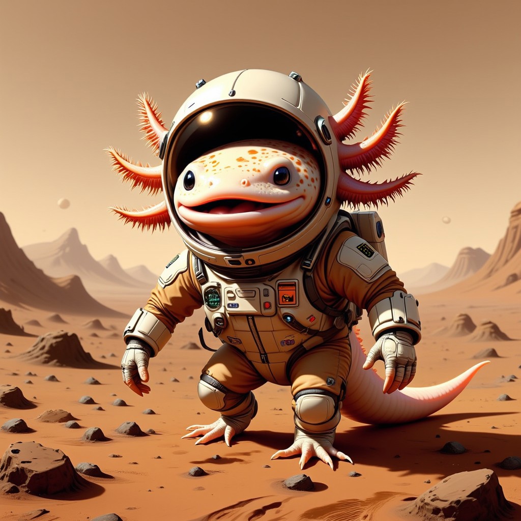 An axolotl wearing a space suit and large transparent helmet exploring the surface of mars