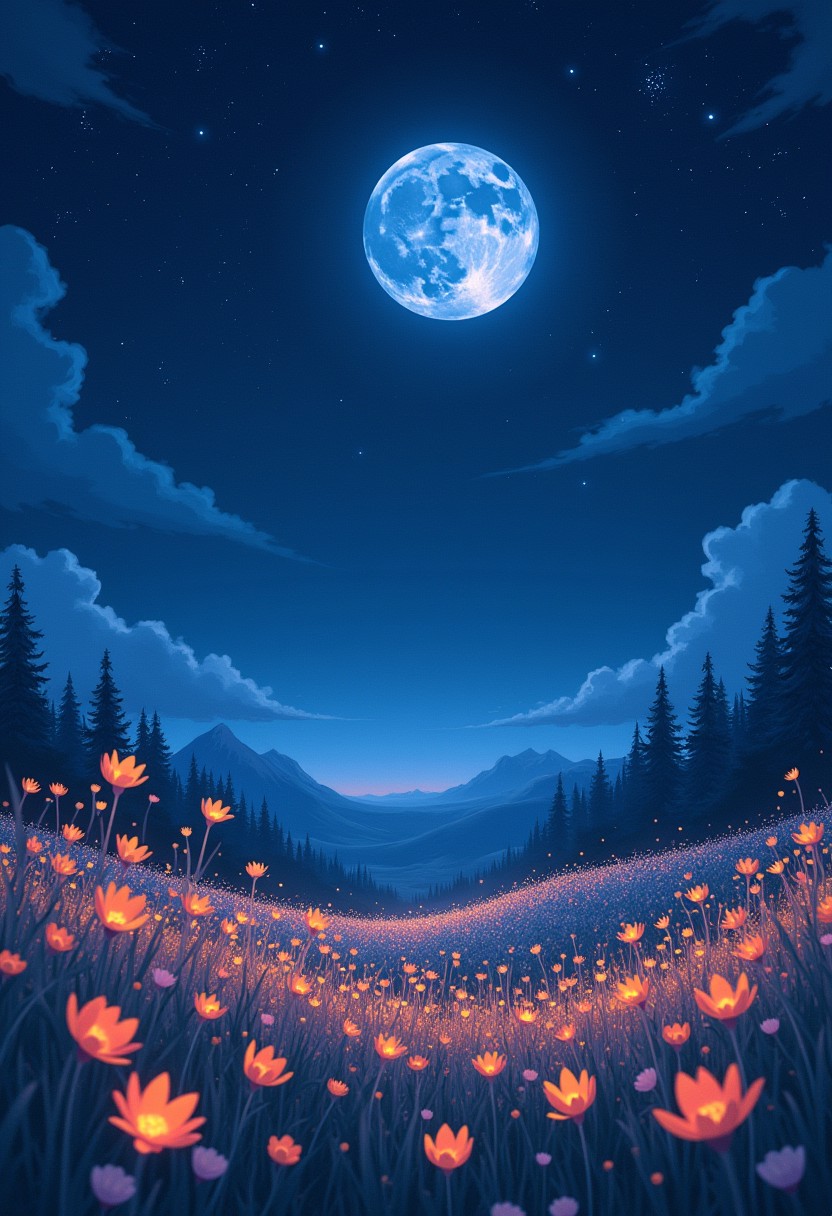 masterpiece,best quality, highly detailed, score_9, score_8_up, score_7_up, score_6_up, BREAK, solo, Expressiveh, night sky, starry sky, moon, moonlight, flower field with luminating flowers, ((medium size text that says "Goodnight" and "I love you" in sky)),