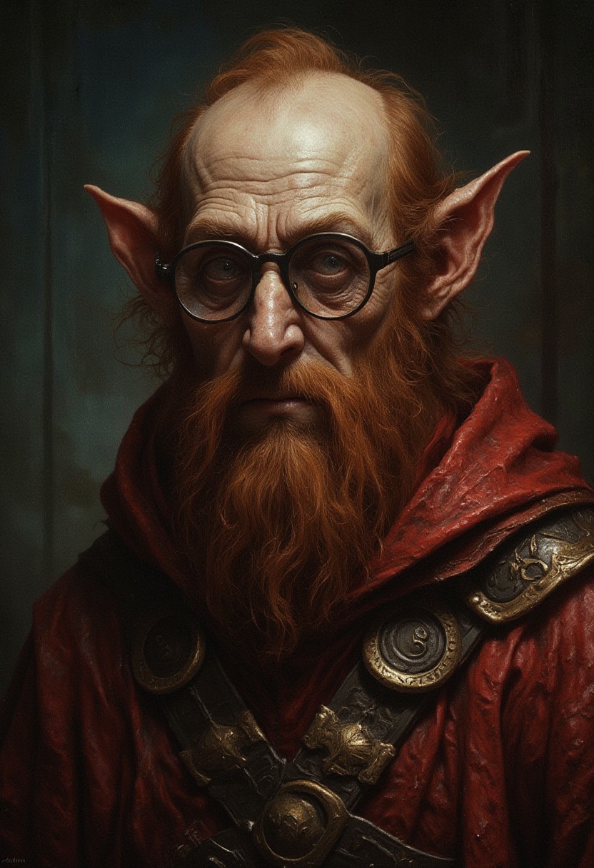 DnD_Grainyboyz,grainy, noise, Dark cyberpunk artwork of THE PROGENITOR OF LUST, Extremely hyper realistic detailed, gnome with short reddish brown beard and glasses, , in the style of a frank frazetta oil painting ,in the style of an old 80's VHS dark fantasy, VHS screen grab, grainy, old footage