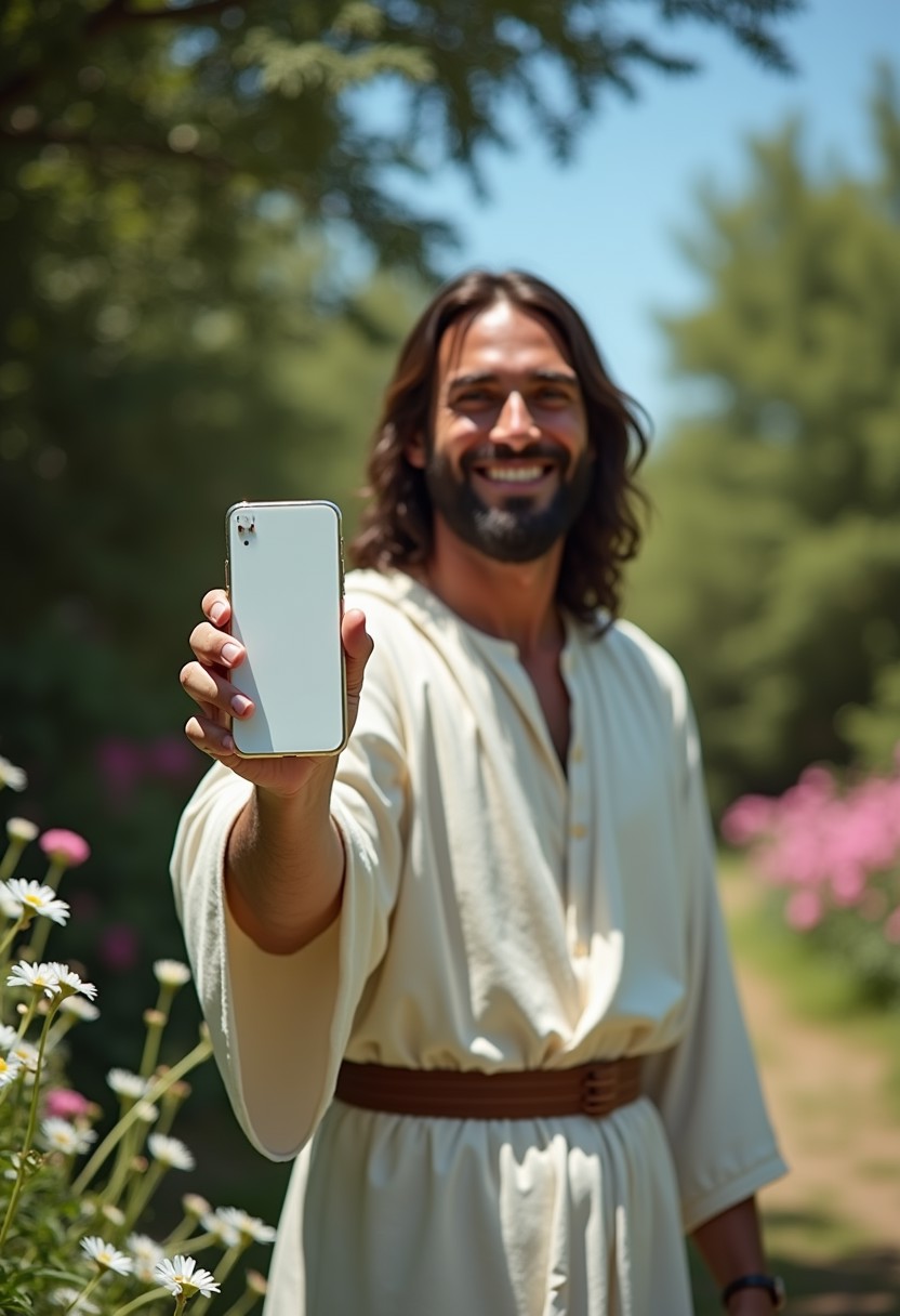 CONSISTENT portrait close-up photo of Jesus smiling and extending his hand holding an iphone horizontally showing the white screen towards to you under the shadow of shady tree in old garden, pink azalea and white daisies, bright blue sky, city street sketch, 8k, professional photography, masterpiece, sharp focus, (perfect composition), (rule of thirds composition), highly detailed, intricate detailed, perfect body anatomy, (((-bad hands -unnatural hands -fused fingers -too many fingers))), (((wide angle lens))), ambience lighting, (((cinematic))), eye level camera, taken with 30MP DSLR, photo realism, award winning photography, best quality
