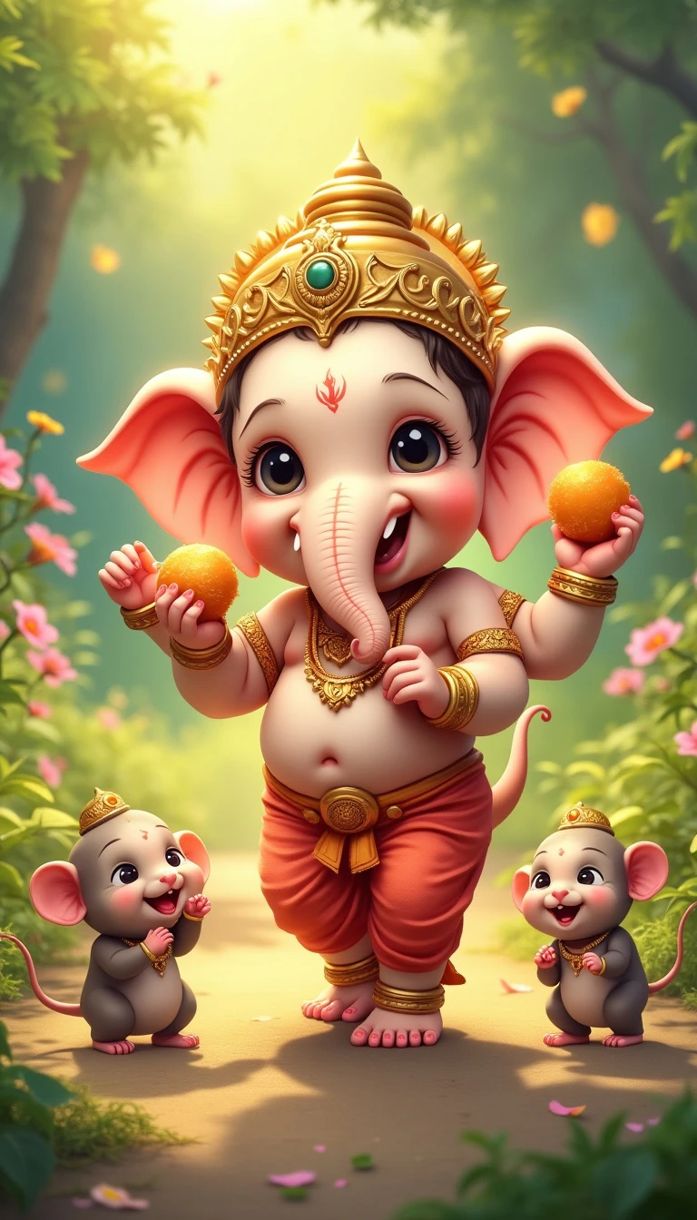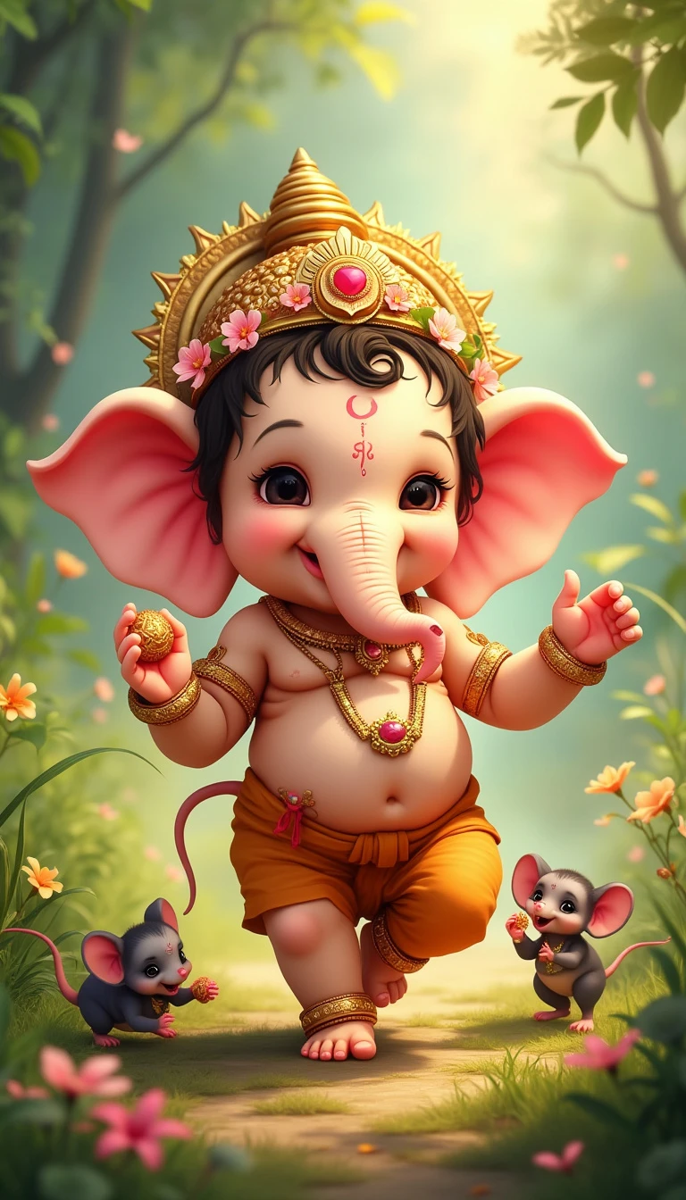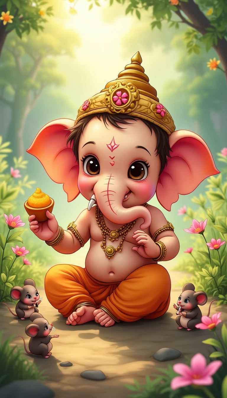 A charming and adorable depiction of Bala Ganesh, the young form of Lord Ganesha, set in a vibrant and playful environment. Bala Ganesh is shown as a small, chubby child with a radiant smile, his elephant head perfectly proportioned to his youthful form. He has large, expressive eyes filled with innocence and wisdom, and his trunk is gently curled, playfully holding a modak (a sweet treat). He wears a simple golden crown adorned with flowers, and his body is draped in a small silk dhoti, with a gold waistband and anklets. His ears are large and fan-like, symbolizing his attentiveness to his devotees. Surrounding him are small mice, his faithful companions, playfully running around him. The background is a lively, colorful scene with lush green grass, flowers in bloom, and a soft, golden light that adds a divine aura to the setting. The overall mood is one of joy, innocence, and the playful energy of the young Ganesha