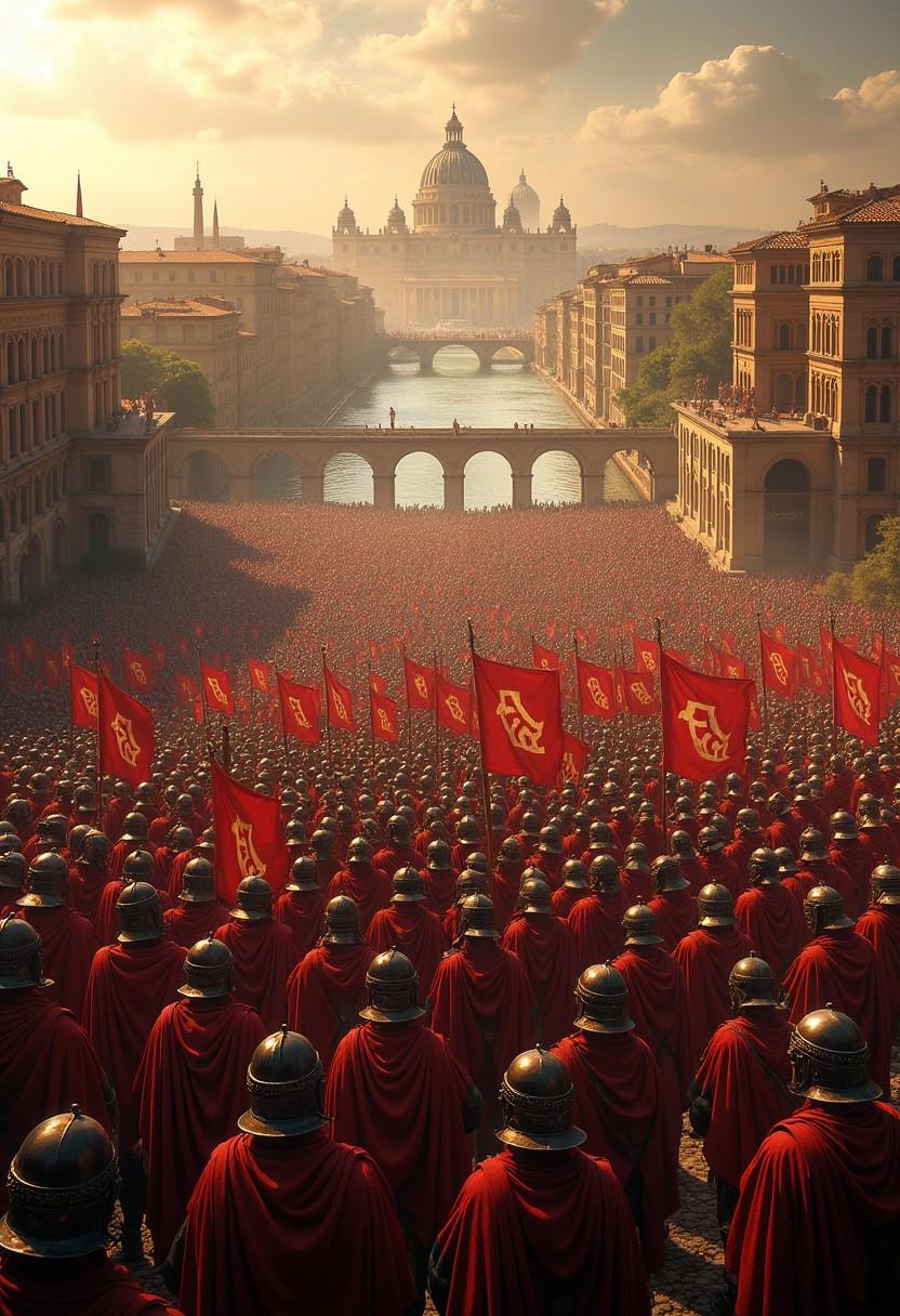 A breathtaking scene of ancient Rome, dominated by the disciplined ranks of Roman legions in full battle formation. Soldiers in gleaming armor and crimson tunics march with unwavering precision, their shields raised high, and banners of SPQR fluttering proudly in the wind. The towering arches of ancient aqueducts and majestic temples serve as a backdrop, bathed in the warm glow of the setting sun. The Tiber River winds through the city, reflecting the glory of the legions as they prepare for a triumphant parade. The air is filled with the sound of drums and the echoes of history, capturing the might and grandeur of Rome's military power