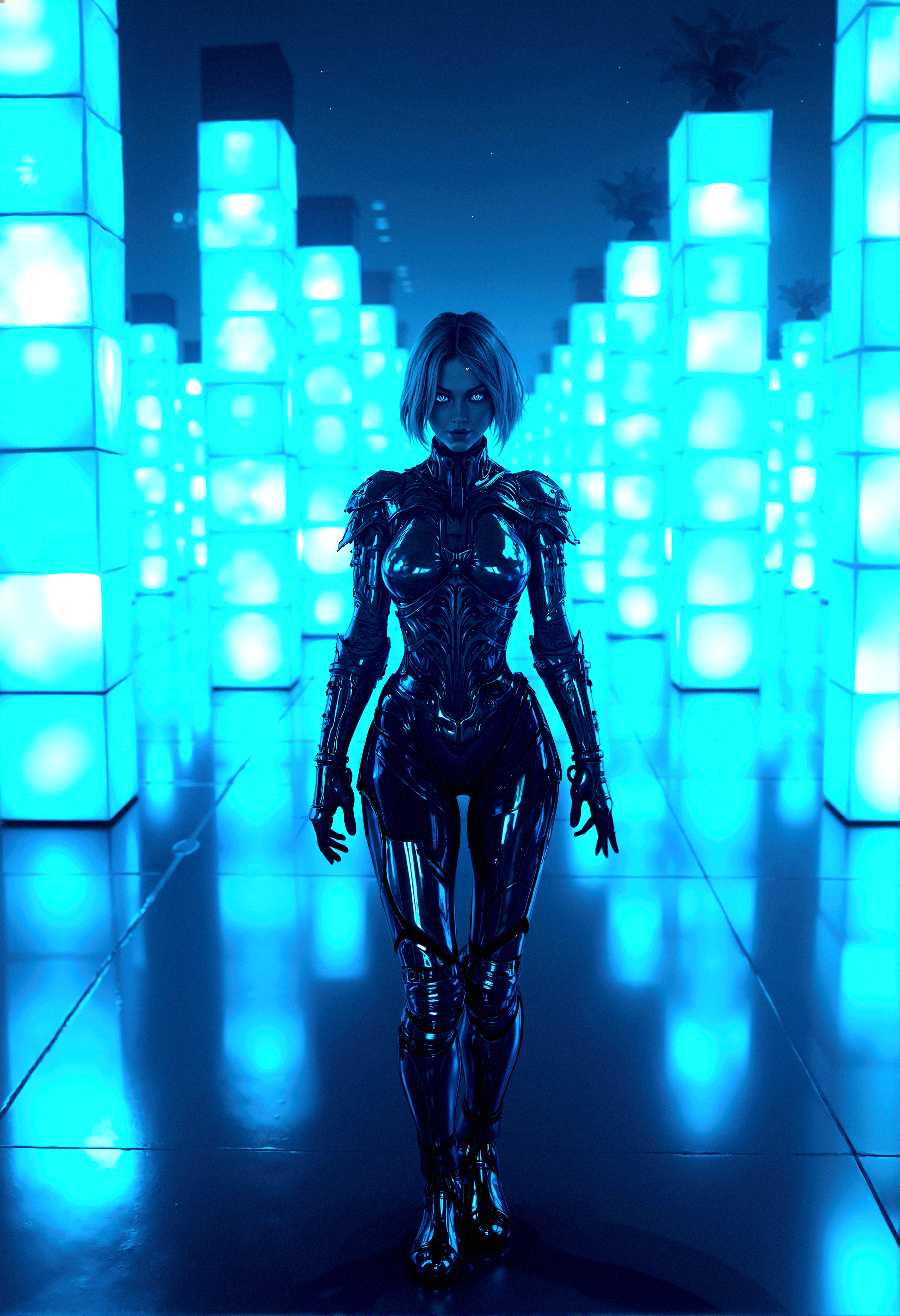 Photorealistic portrayal of a female warrior with cybernetic enhancements, standing confidently in an expansive room of glowing blue cubes, her figure illuminated by the soft, ambient light reflecting off the geometric surfaces. The female warrior standing in front of a wall of glowing cubes, her hands resting on her hips, as she gazes forward with a confident expression, the light reflecting off her armor and creating a sense of depth. The cubes emitting a soft, ambient hum or sound, adding an auditory dimension to the visual elements, enhancing the immersive quality of the environment. An extreme close-up shot focusing on the female warrior’s eyes, capturing the reflection of the glowing cubes within them and adding intensity to her gaze. short hair, hime cut, cinematic lighting, extremely intricate detail character, accurate depiction of character, correct body anatomy, correct hands and fingers, extremely intricate skin and facial texture detail, design,lifelike potrayal, extrememly realistic lighting, extreme dynamic pose, sfw, fully clothes, sharp background detail, wide shot