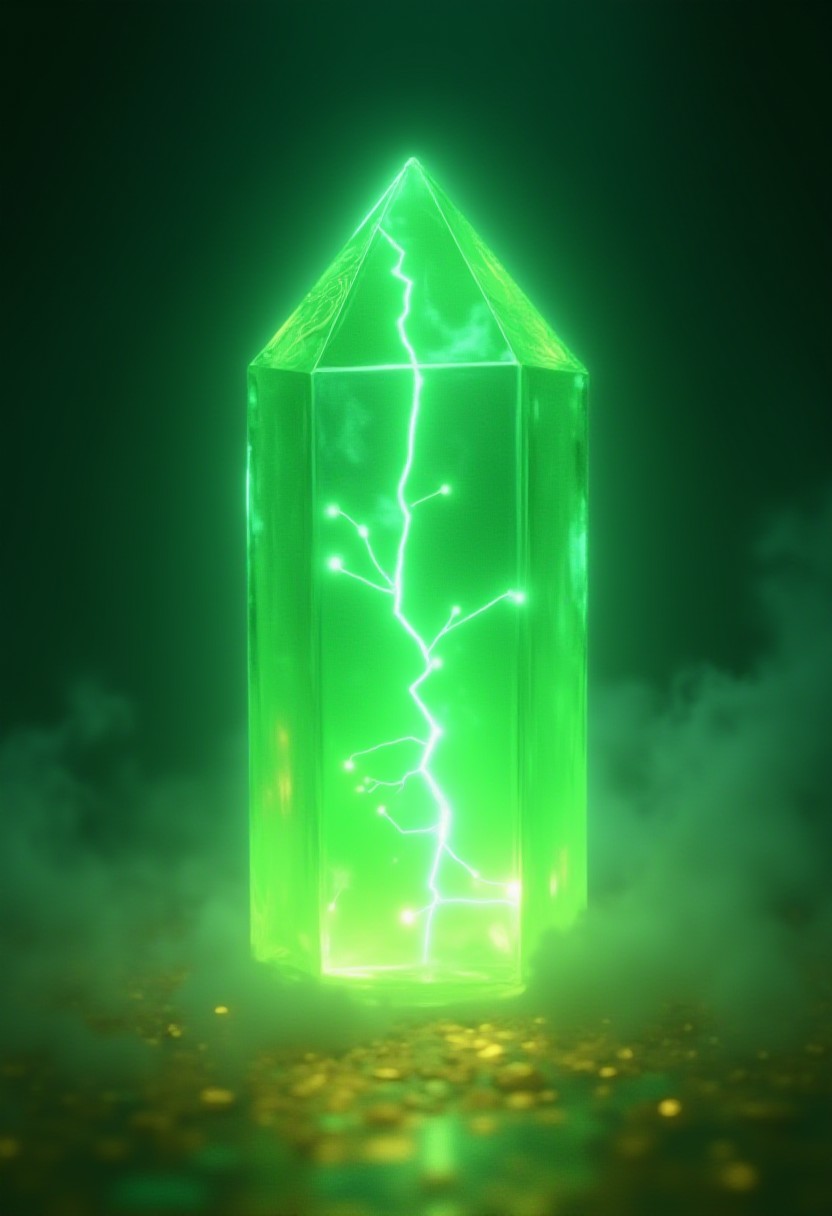 A photorealistic 4K image of a glowing green crystal with smooth, rounded edges, floating above a pool of shimmering liquid gold. Inside the crystal, tiny lightning bolts crackle and dart, illuminating hidden runes that pulse with energy. The crystal emits a soft, ethereal glow that reflects off the surrounding mist, creating a mystical atmosphere. Wisps of smoke curl around the crystal, adding to the sense of mystery and power. Masterpiece quality, highly detailed