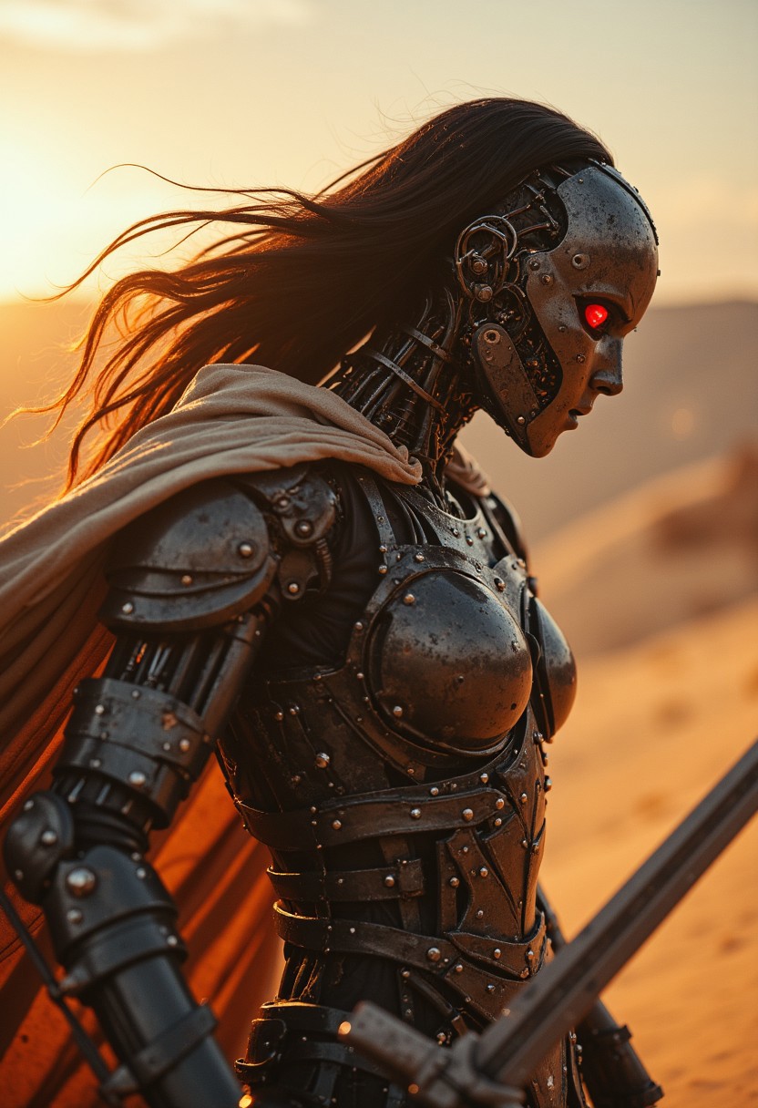 Extreme Face Closeup, FredFraiStyle, upper body closeup shot, old grainy analog photo, bad image quality, heavy film grain, monochrome with low key color spots, Create an action scene featuring a intricately wired and mechanical robot Knight with Female head and Long hair in a broad outworn cape, standing in the midst of an desert forest. He is executing a powerful sword strike that carves a furrow through the sand on the ground, scattering them away or disintegrating them with the force of the blow. The focus is on the intricate designed head of the robot in motion, showcasing the reddish blur of light that eye trails with the swift motion of the slash, capturing the dynamic speed of the fighter. Pressure Wave, floating particles, The warriors stance is calm and cool, with only his silhouette visible against the backdrop of the setting sun, which shines through parts of his metallic body. His billowing Linen cape adding to the dramatic effect. The scene is vibrant with atmospheric lighting and cinematic composition.