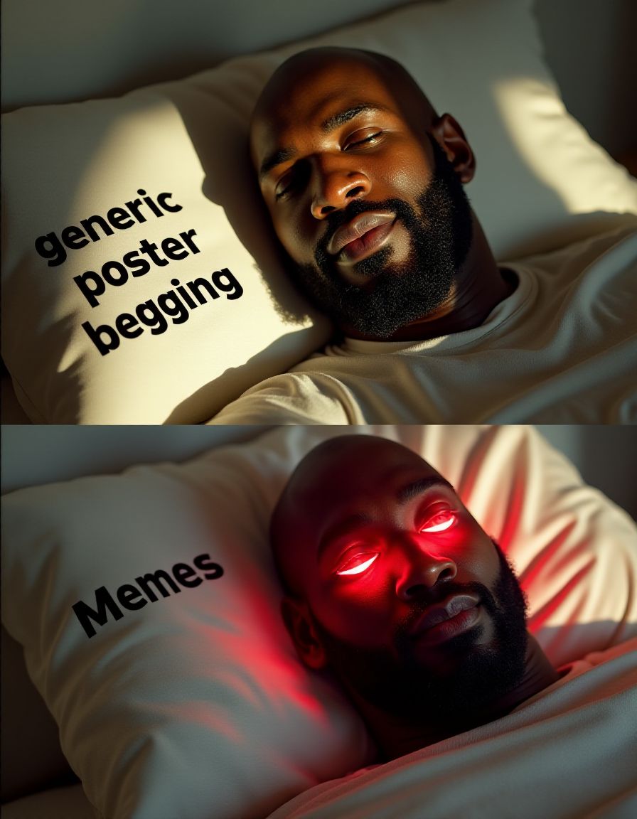 in left top quarter of image text "generic poster begging" written with huge black letters on pillow , in left bottom quarter of image text "memes" written with huge black letters on pillow , in right top quarter of image face of bald bearded black man (Shaq O'Neal) peacefully sleeping on white pillow in sunlit room , in right bottom quarter of image face of same awake bald bearded black man (Shaq O'Neal) with glowing red opened eyes emitting red light in all directions