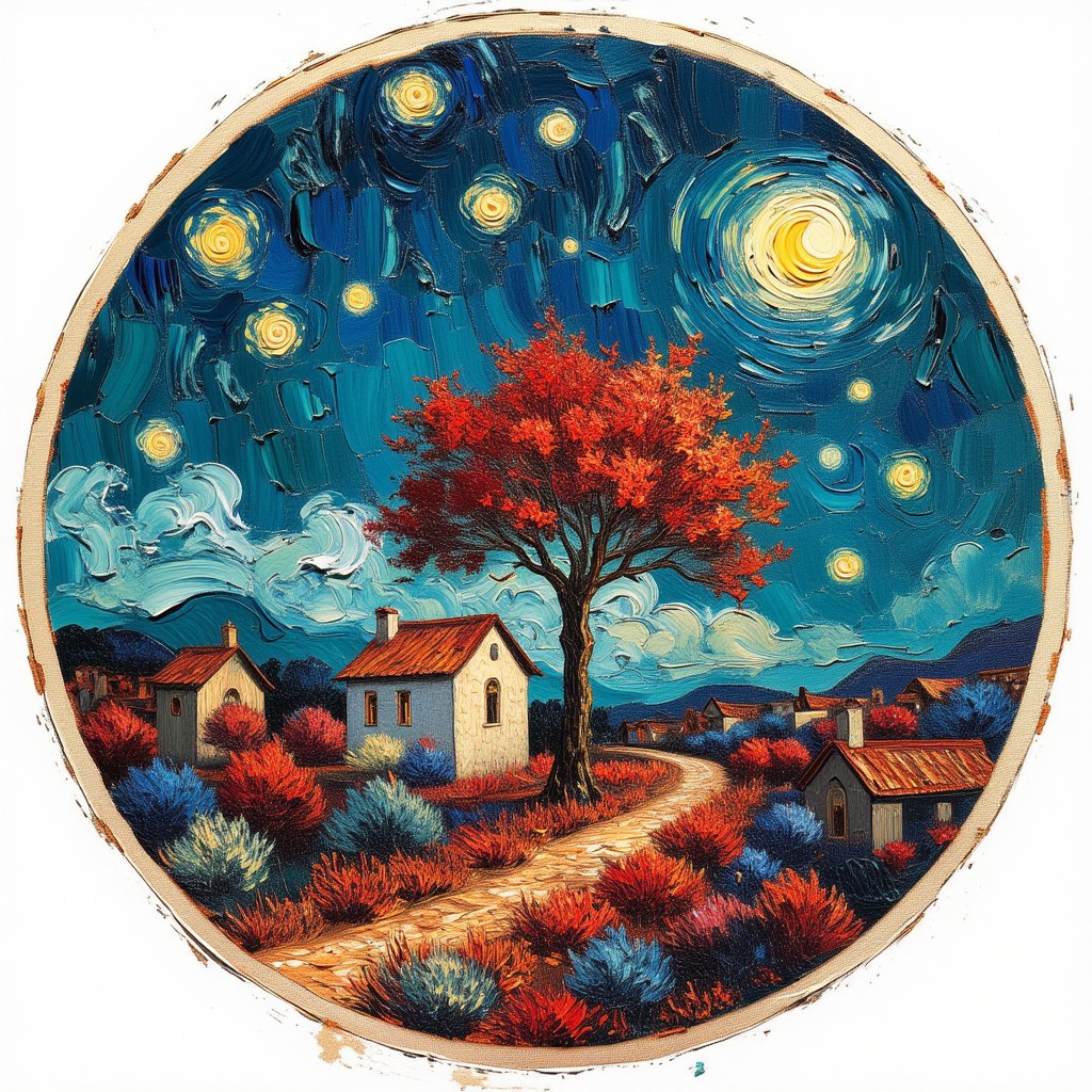 Create an image featuring two contrasting scenes within circular borders, one on top of the other. The upper circle shows a night sky with stars and a crescent moon, with a solitary tree bearing red foliage against a teal background. The lower circle portrays an intricate village scene with various buildings, trees, and possibly people or creatures in reds and blues. Both circles share a common point at the bottom of the upper circle and the top of the lower one, suggesting a connection or reflection between the two scenes,style of Vincent van Gogh