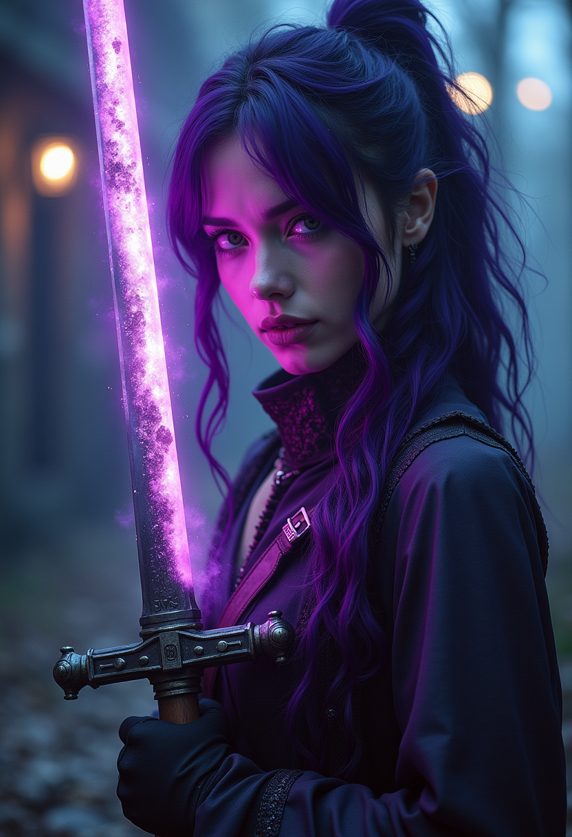 Detailed, masterpiece, professional, bold colors, awe inspiring, photography inspired by Jeremy Mann and Kelly McKernan, 30mm shot, action scene, HDR, bloodborne themed, epic atmosphere, female warrior against impossible odds, gloomy, Victorian era, holding cosmic infused purple poison sword, feminine, inspired by Agnes Cecile, glowing aura, cosmic eyes, purple hair