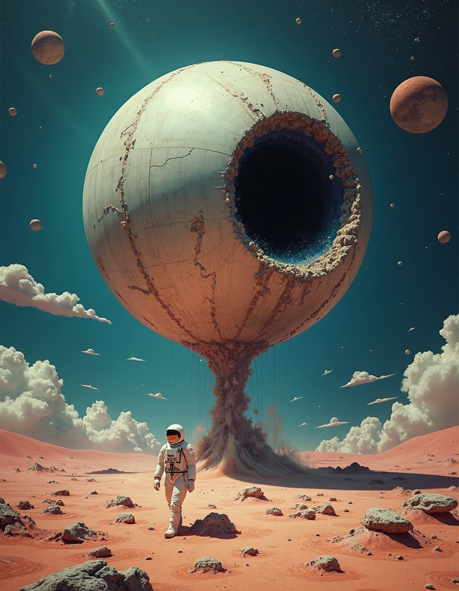 art by Scott Listfield and Tristan Eaton, In a surreal, swirled landscape made entirely entirely of crystal-stained silver sphere is explored. This is no ordinary machine. As the universe explodes into a menacing black hole with explosive gravitational force emanating from it. It's as though this otherworldly creature embodies cosmic engineering and creates chaos as the vessel touches down on Earth beneath its surface of darkness that consumes all who gaze upon it. , very coherent, dramatic, grand illumination, quality, contemporary realism, astronaut, pop culture references, surreal landscapes, Urban art, pop culture references, colorful