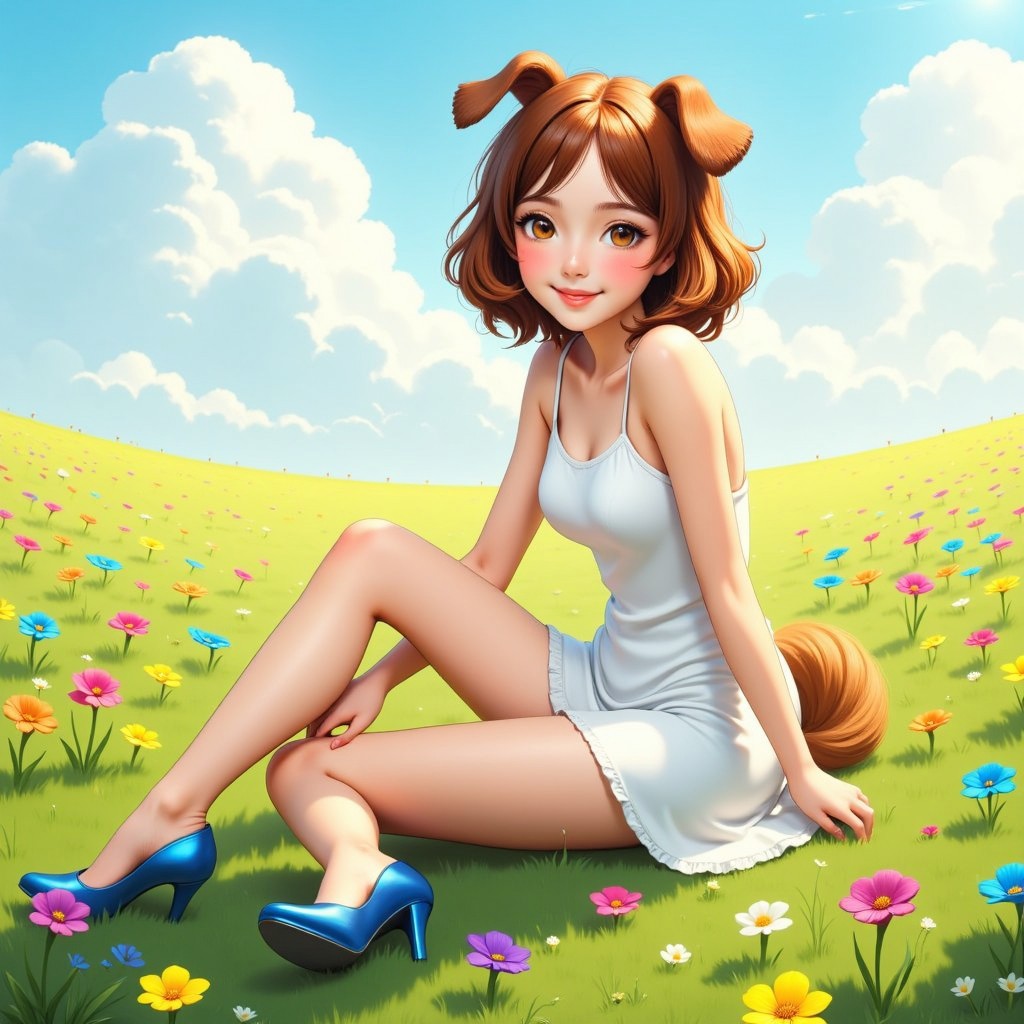 a beautiful girl with dog ears sitting on a meadow with colorful flowers, wearing a short white dress and blue high heels,TzigoAnimeStyle