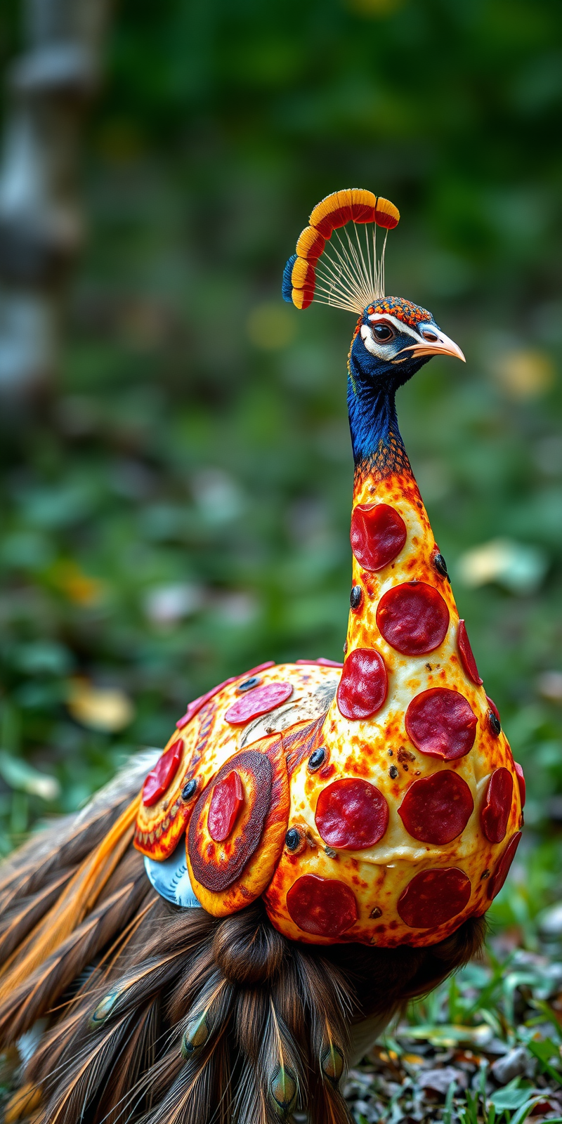 digital art of a peacock in nature, the tail of the peacock is made entirely out of pizza,the eyes on the tail are represented by salami slices,the image represents an unnatural mockery of nature,the image has a realistic looking texture and lighting