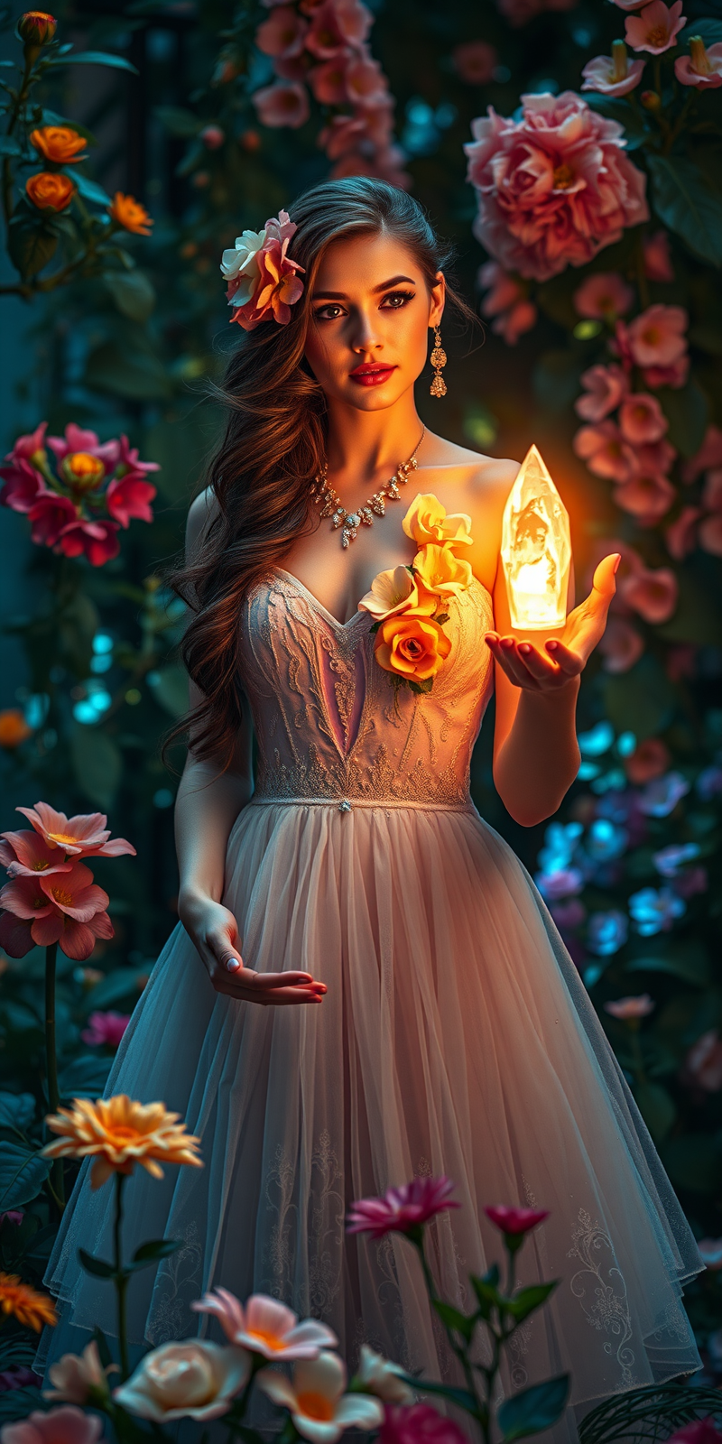 Cinematic style, realism, cinematic quality, close-up, ((glowwave)) visuals, bright colorpop, cinematic lighting, hypermaximalist, extremely detailed with rich color, An image of a beautiful woman, dressed in an ethereal gown and adorned with flowers, standing at the center of a lush garden. In her hand, she holds a glowing crystal that emits a soft light, illuminating her and the surrounding area. As if by magic, the flowers around her are blooming in vivid colors, creating a mesmerizing display that is both surreal and breathtaking