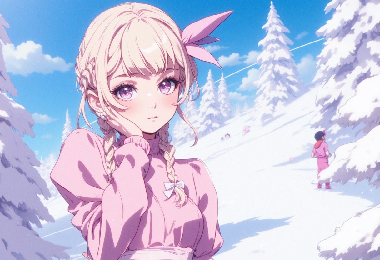 A cheerful anime-style girl with blonde hair styled in two braids, wearing a pink blouse with a white ribbon and a pale pink skirt. She is standing on a snowy mountain slope with snow-covered trees and a clear blue sky above. The girl is smiling and making a peace sign with her hand. The overall scene should have a bright and colorful atmosphere, with the main tone being pale pink. Incorporate more pink tones into the background, such as pink ski equipment and accents in her outfit. detail eyes, magic eyes, de01