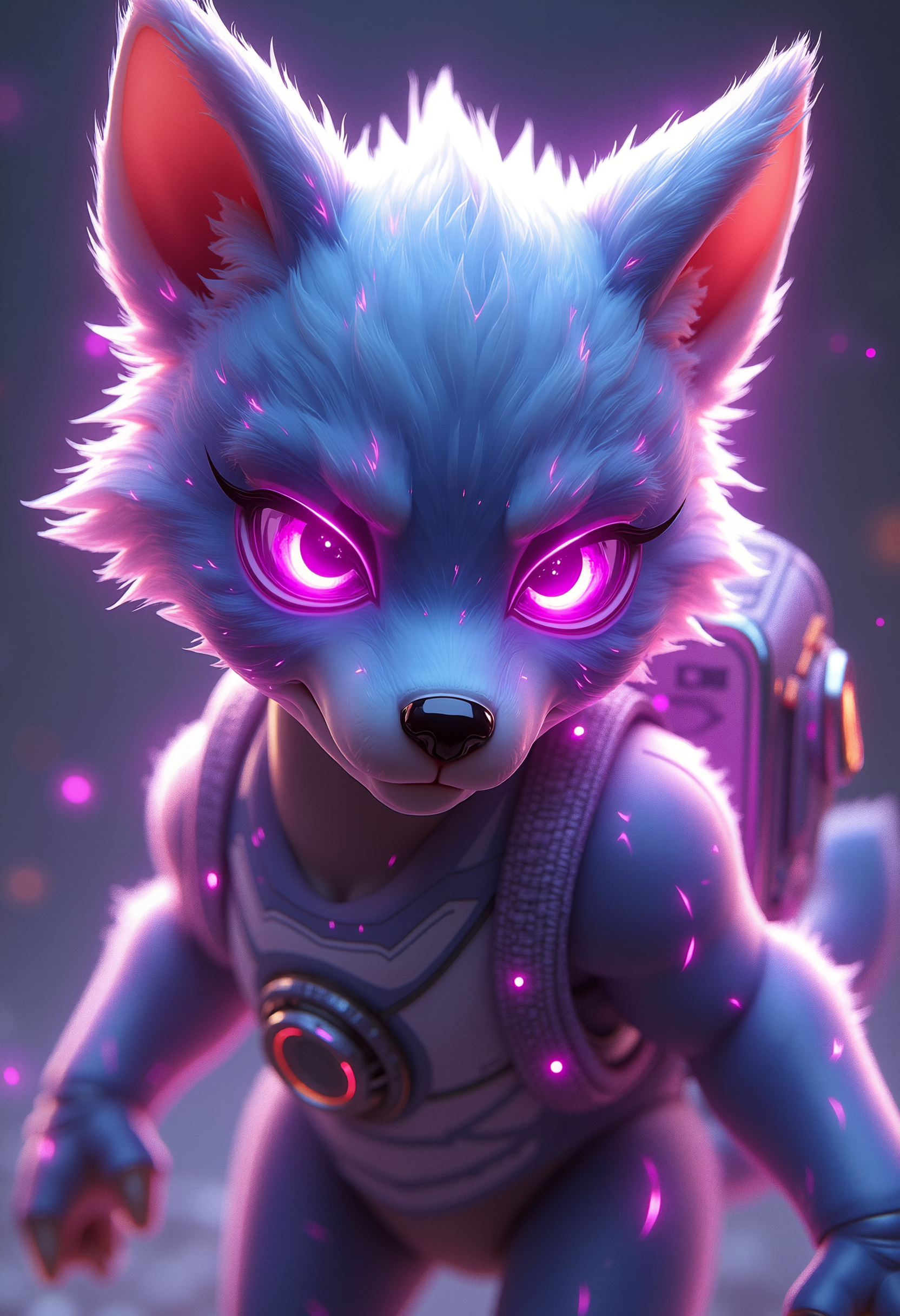 upper body shot, dynamic action fighting stance pose, face and skin made entirely of translucent glass and glossy futuristic reflective transparent panels, body and everything made out of futuristic transparent spaceship panels, bright highlights of reflected showroom style lighting, baby Wolf pup of Thunderstorms, cute, wearing futuristic backpack, game character expression, hero pose, close up shot, face detail, the refleciton of a burning purple flame in highly crisp and sharp eyes, incredibly detailed with intricate cybernetic patterning on the glossy transparent and reflective glass and chrome body, fierce facial expression with endearing eyes and deep pupils looking directly into the camera, reflections and glow, sparkling cyber crackling texture running through glass like electrical current, silver and gold reflective pearlescent accents,
