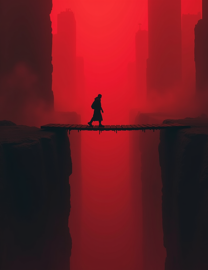 a small silhouetted character walking on a precarious wooden plank bridge, suspended high above a deep, fog-filled chasm. The scene is bathed in red tones, creating a moody atmosphere. The towering structures on either side of the chasm resemble tall, ominous buildings which seem to close in as they rise toward the top of the image, emphasizing the height and depth of the setting. The overall composition gives a sense of isolation and danger,