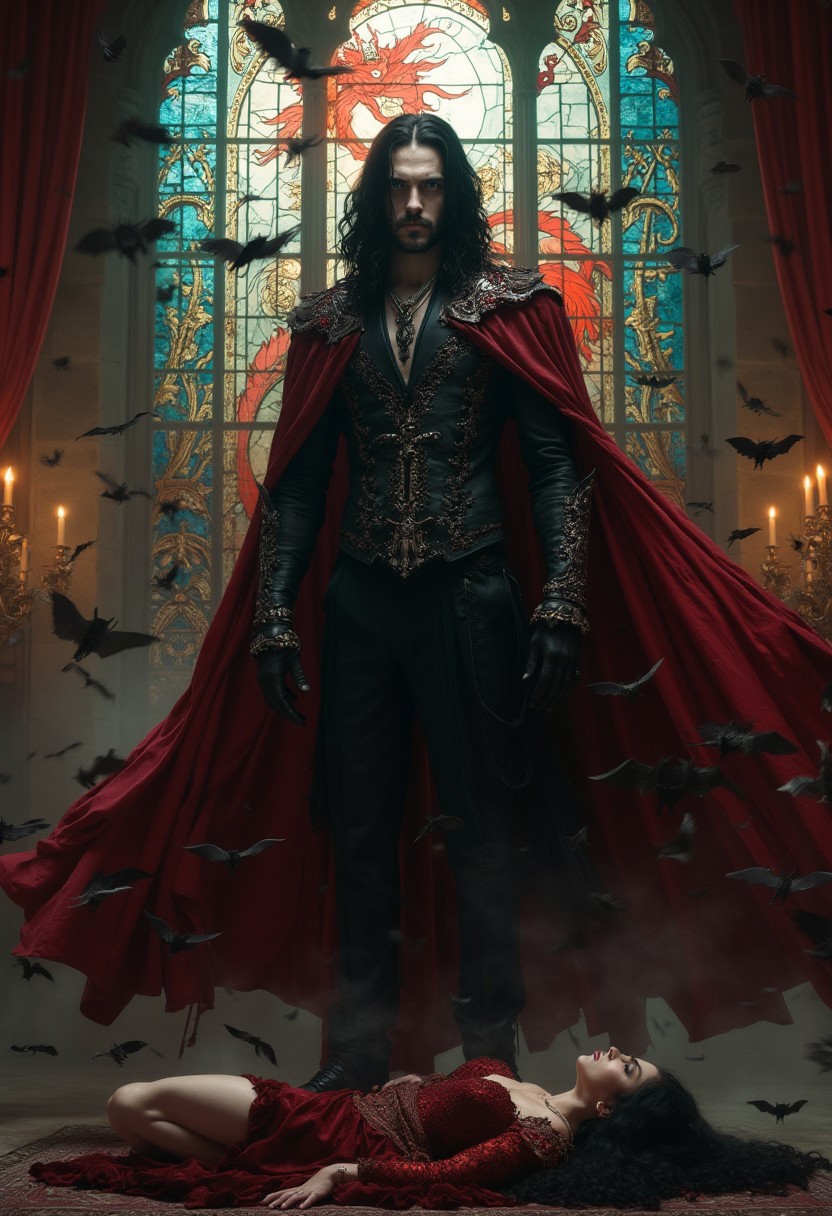 8k wallpaper a vampire lord majestically hovers above the grand throne room, surrounded by a whirlwind of flying bats that circle around him like a storm. He is dressed in a black leather outfit adorned with crimson velvet accents and a flowing red cape. The sleeves of his attire feature elaborate lace cuffs reminiscent of the fashion in Édouard Manet's painting "The Boy in the Majo Costume." His long, wavy black hair cascades down to his shoulders. Below him, a noblewoman from an aristocratic family lies on the floor, seemingly unconscious or under his spell. The throne room, styled in Gothic Renaissance architecture, is dimly lit by candelabras, with rich red drapery hanging from the ceilings. Behind him, a large stained glass window depicting a red dragon is illuminated by the moonlight, casting an eerie glow over the scene, adding to the dark and opulent atmosphere, style of Benedick Bana, messy, streaks, Maciej Kuciara, 8k photo, cinematic, highly detailed, looking at viewer. perfect Composition, realistic photographic image, RAW photo highest quality, perfect directional lighting, <lora:other/flux_realism_lora:1.0>