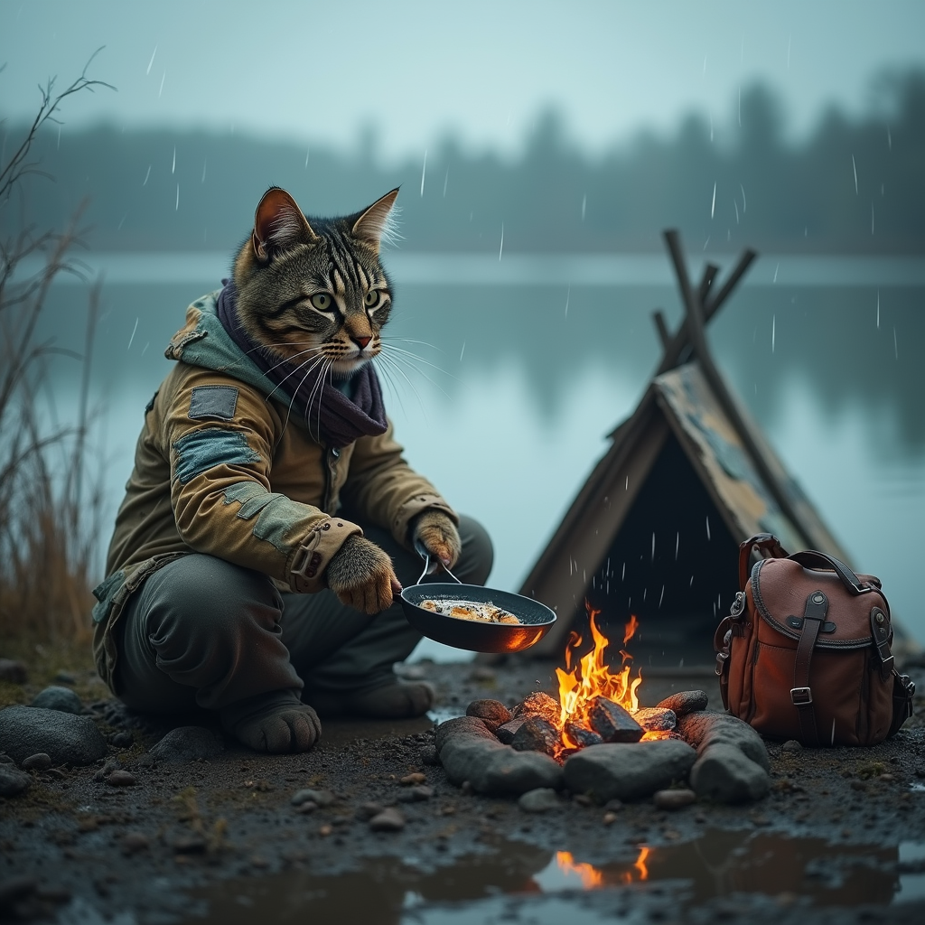 An anthropomorphic stray cat, dressed in old, tattered clothes with patches, sits on the shore of a quiet lake on a rainy, gloomy day, a small fire burning. The cat is frying fish in a small frying pan, which the cat holds in his hand, the fish looks fried. The cat's makeshift camp consists of a small, patched-up tent made of scrap materials, the tent is near the cat, in the background. Next to it is a worn-out backpack standing on the shore of a lake. It is wet and cold around, rain is gently falling, and the surface of the lake is rippled by waves, reeds are growing on the shore. The overall atmosphere is gloomy but peaceful, captured in a realistic, professionally taken photograph that emphasizes the cat's simple life and connection to nature.