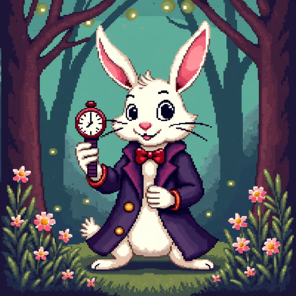 The image is a C64 pixel style illustration of the White Rabbit in Wonderland holding a watch. Wearing a fancy coat. Forest field background