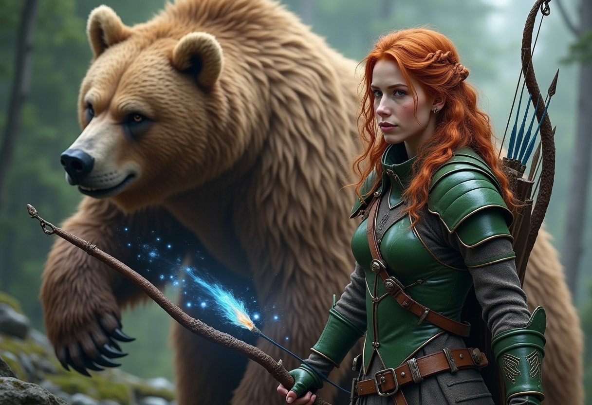 photo realistic picture of a ginger archer woman with a bow and arrow, using green armor, and a grizzly bear companion. By their side there is also a little blue magic flame flying, with little blue sparkles around. Highly detailed.