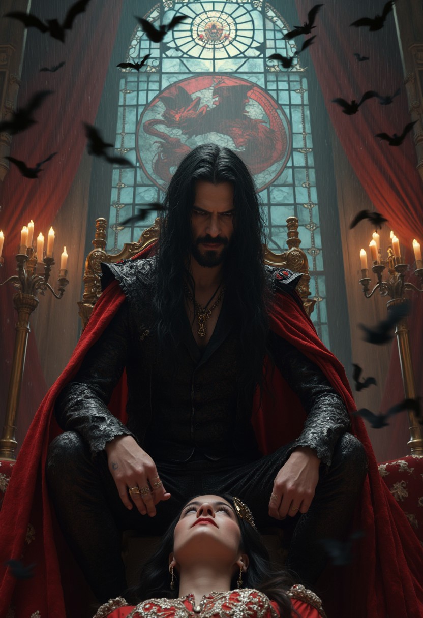 8k wallpaper a vampire lord majestically hovers above the grand throne room, surrounded by a whirlwind of flying bats that circle around him like a storm. He is dressed in a black leather outfit adorned with crimson velvet accents and a flowing red cape. The sleeves of his attire feature elaborate lace cuffs reminiscent of the fashion in Édouard Manet's painting "The Boy in the Majo Costume." His long, wavy black hair cascades down to his shoulders. Below him, a noblewoman from an aristocratic family lies on the floor, seemingly unconscious or under his spell. The throne room, styled in Gothic Renaissance architecture, is dimly lit by candelabras, with rich red drapery hanging from the ceilings. Behind him, a large stained glass window depicting a red dragon is illuminated by the moonlight, casting an eerie glow over the scene, adding to the dark and opulent atmosphere, style of Benedick Bana, messy, streaks, Maciej Kuciara, 8k photo, cinematic, highly detailed, looking at viewer. perfect Composition, realistic photographic image, RAW photo highest quality, perfect directional lighting, Perfect Composition, cowboy shot from the front, closeup portrait, <lora:other/flux_realism_lora:1.0>