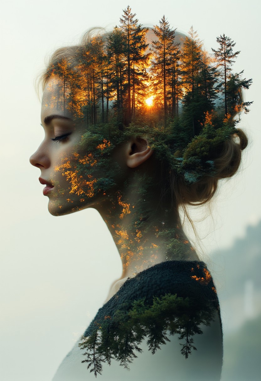 A mesmerizing double exposure portrait that seamlessly blends two captivating images. The main subject is a serene profile of a young woman with delicate features, her eyes closed in peaceful contemplation. Overlaid within her silhouette is a vast, breathtaking landscape of a dense forest at sunrise. The trees, bathed in golden light, stretch upward, their branches intertwining with her hair as if she is one with nature. The soft, ethereal glow of the morning sun filters through the leaves, casting dappled light across her face and creating a dreamlike atmosphere. The effect is enhanced by the subtle "Glitter" of dewdrops on the leaves, catching the light and adding a touch of sparkle to the composition. The background of the portrait fades into a soft, blurred gradient, allowing the double exposure effect to be the focal point. The overall image captures the harmonious blend of human and nature, symbolizing a deep, almost spiritual connection between the two, with the double exposure technique adding depth and a surreal, artistic quality.