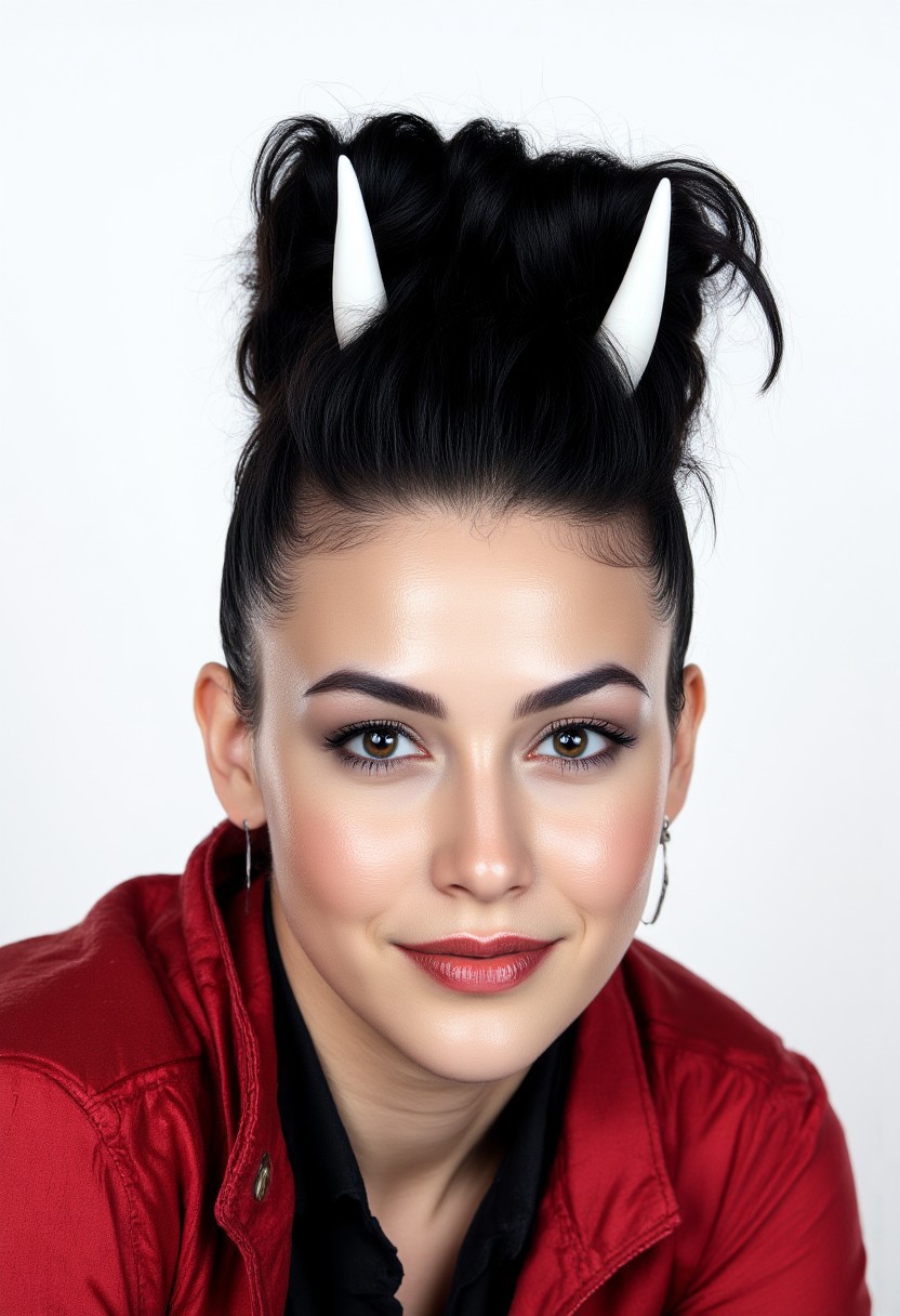 An midjourneyv6.1 style image of a real demon girl with an absurdly aesthetic style worthy of being called a masterpiece. She is the only object of attention in the picture, standing out against a simple white background so that the upper part of her body is visible. She has a perfect face and figure, white skin, piercing black eyes and a spectacular black hairstyle in the form of a short square. She's wearing a chocker and a shirt, and the overall color scheme includes red and black accents to create a bold look. She has long white horns, seductive smile and looking straight at the viewer. Her facial expression is mesmerizing, the particles thought out to the smallest detail, detailerlora, and the colors create the perfect realistic style atmosphere.