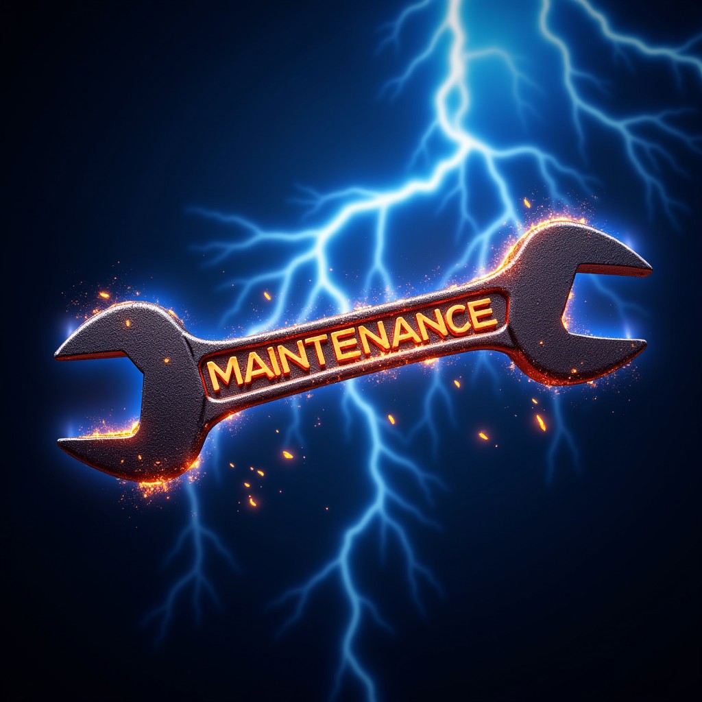 Wrench inscribed “MAINTENANCE”, fire and sparks with blue Lightning background,