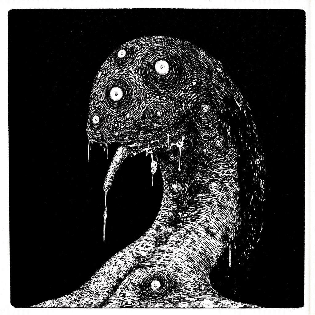 wizardry, illustration, monochrome, Sketch a chaos beast in the style of Junji Ito, take inspiration from the dark souls games and bloodborne or Elden Ring, jitostyle, simple background, black background, concept art