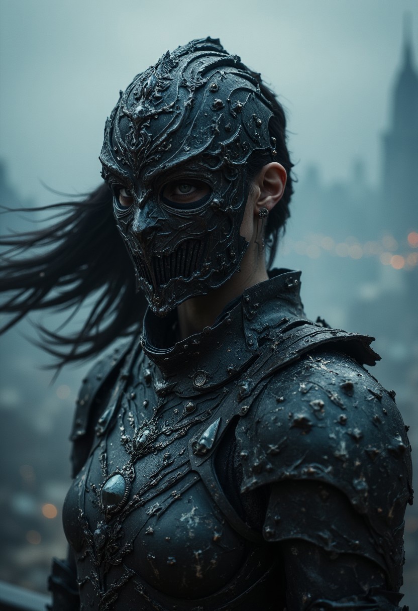 Atmospheric haze, foggy atmosphere, high quality analog photography of a woman wearing an intricate FredFraiStyle inspired black and vibrant thin dark intricate designed armor with high collar, Highly detailed close-up action scene of a knight in intricately patterned armor. Long billowing hair, The focus is on the knight’s helmet, showcasing intricate designed visor that is emitting a pale turquoise blur of light that trails with the swift motion, capturing the dynamic speed of the fighter. The scene is set in a misty, fog-filled night with a desaturated color palette. The background is hazy Metropolis, while motion streaks and dynamic lighting enhance the sense of speed and intensity, with the knight’s glow piercing through the mist, impressive powerful stance, very detailed, moody DARK dystopian villain themed analog photo