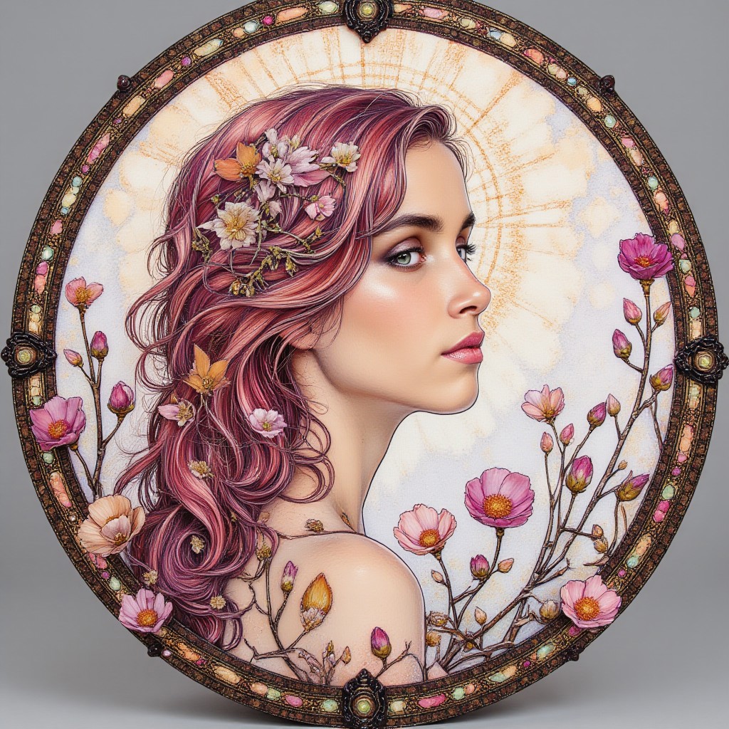 ArsMJStyle, art nouveau,Alphonse Mucha, The Serene Queen A graceful queen with flowing hair adorned in intricate gold and jewel-toned patterns, surrounded by blooming flowers and swirling vines in soft pastel colors.