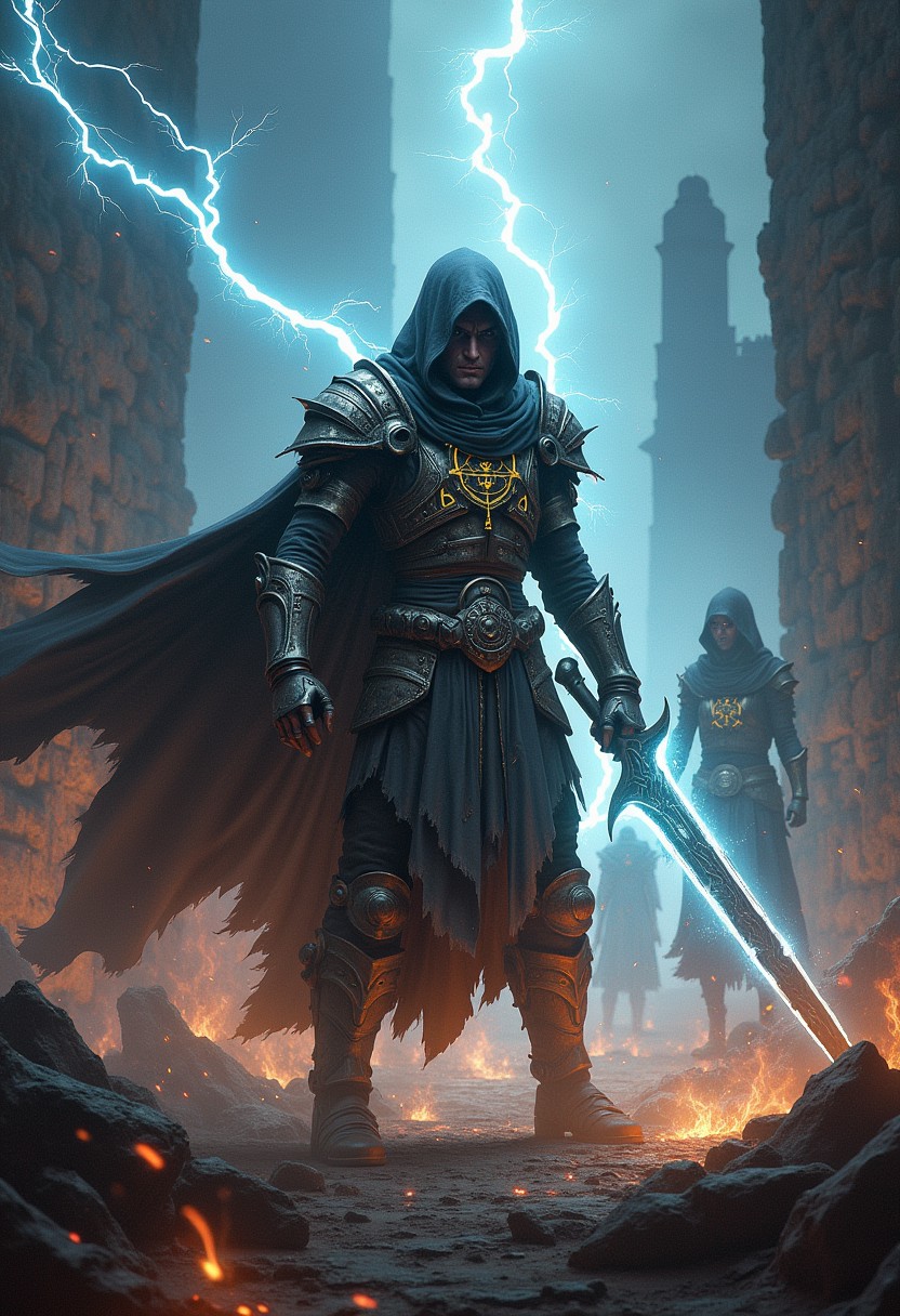 A digital image of a battle mage fighting supernatural opponents. The battle mage, a spellcaster skilled in melee combat, is at the center of the scene, combining magical abilities with martial prowess. They wear lightweight armor adorned with glowing arcane runes. Their cloak billows in the wind, and their expression is fierce and determined. The background, a dark and chaotic landscape stretches out, with ancient ruins shrouded in shadows and crumbling fragments of buildings. Supernatural foes, demonic creatures, and specters surround the battle mage, but they stand firm, channeling magical energy through their enchanted sword and combat staff.\n\nA magical energy barrier, crackling with electricity and fire, shields them as they unleash devastating spells. Sparks of magical energy and arcane symbols float in the air around them, reflecting the intensity of the battle. The atmosphere is tense and charged with power, with dramatic lighting highlighting the figure of the battle mage and their supernatural adversaries.