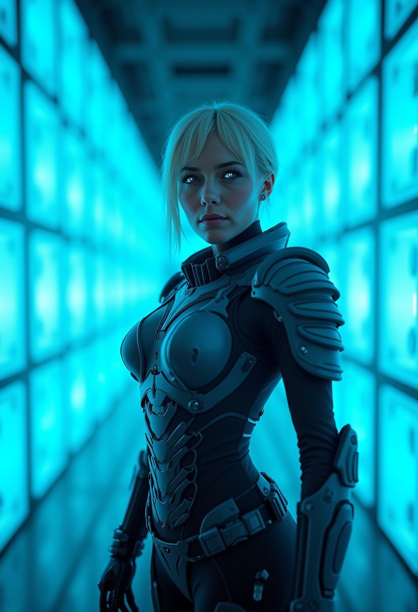 Photorealistic portrayal of a female warrior with cybernetic enhancements, standing confidently in an expansive room of glowing blue cubes, her figure illuminated by the soft, ambient light reflecting off the geometric surfaces. The female warrior standing in front of a wall of glowing cubes, her hands resting on her hips, as she gazes forward with a confident expression, the light reflecting off her armor and creating a sense of depth. The cubes emitting a soft, ambient hum or sound, adding an auditory dimension to the visual elements, enhancing the immersive quality of the environment. An extreme close-up shot focusing on the female warrior’s eyes, capturing the reflection of the glowing cubes within them and adding intensity to her gaze. short hair, hime cut, cinematic lighting, extremely intricate detail character, accurate depiction of character, correct body anatomy, correct hands and fingers, extremely intricate skin and facial texture detail, design,lifelike potrayal, extrememly realistic lighting, extreme dynamic pose, sfw, fully clothes, sharp background detail, wide shot