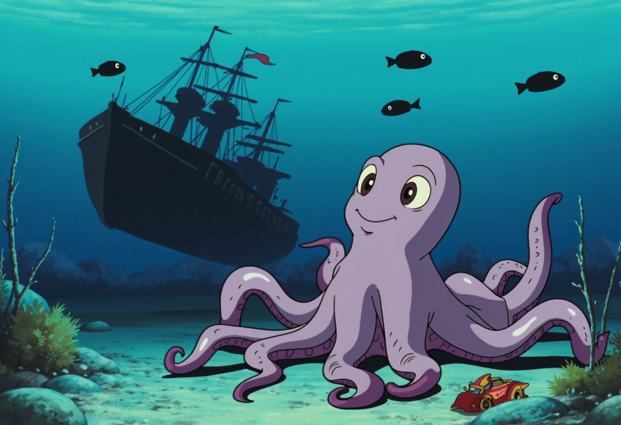 ghiblistyle, smiling octopus, sunken ship, ocean floor, fish on the background