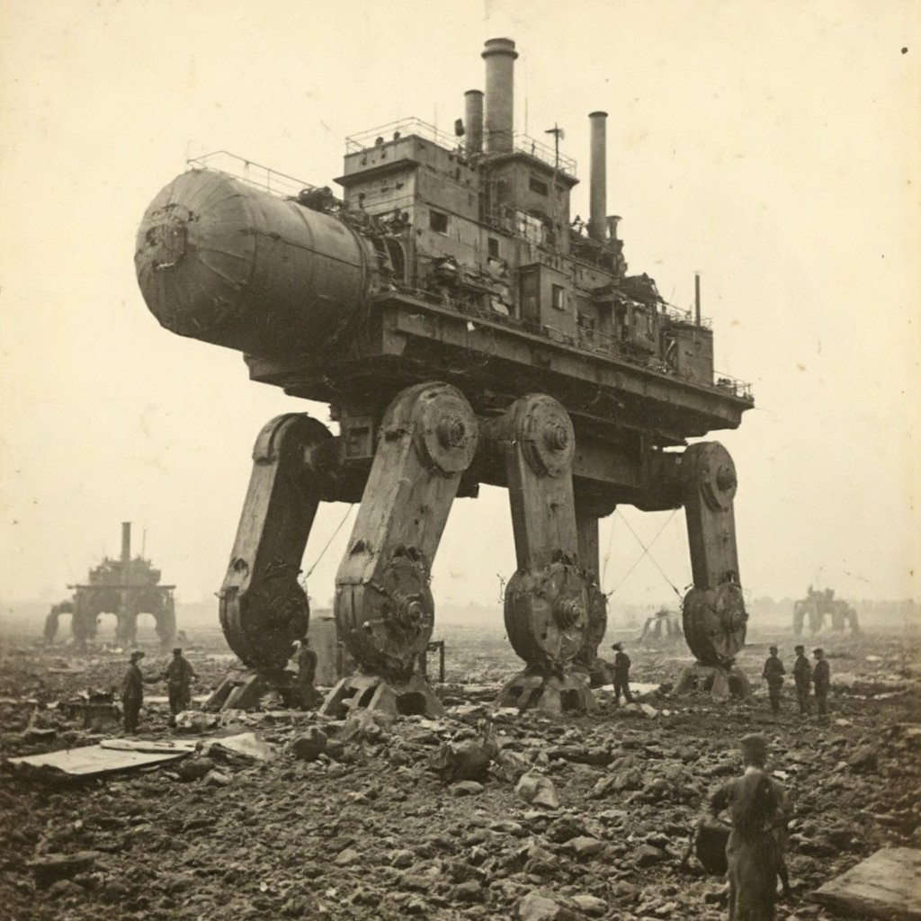 01dPh0t0 dark, shadow, distorted, grainy, film grain, Victorian, An aged worn sepia monochrome 1800s photograph of an enormous steampunk combat mecha, massive four-legged walking machine, huge platform on top with multiple structures and cannons. like a walking battleship, Soldiers working on the platform, walking through a crater-filled battlefield