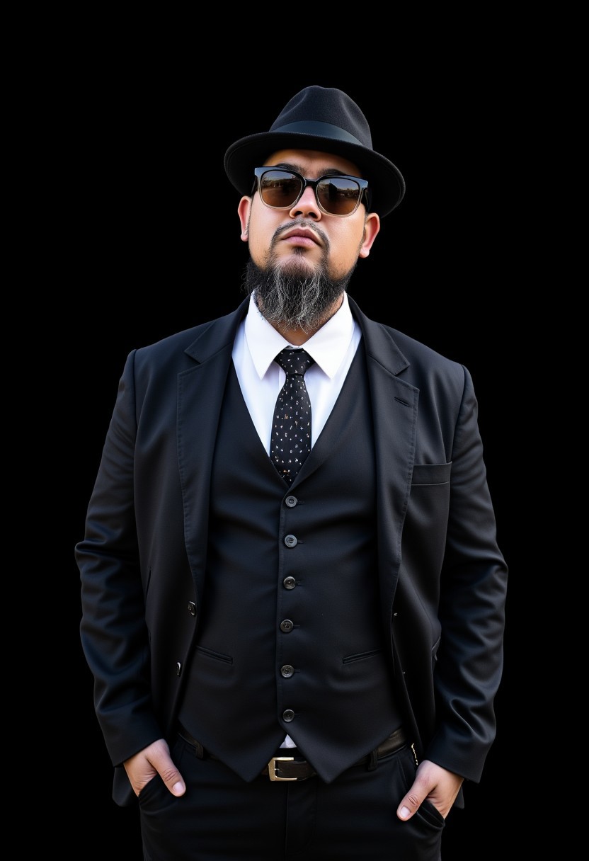 8k resolution, award winning photograph, photo taken with iphone 15 pro, Suit thug, sunglasses, oruga420, solo, 1boy, male focus, hat, shirt, necktie, jewelry, earrings, formal, looking at viewer, collared shirt, black headwear, jacket, white shirt, suit, black jacket, black vest, vest, hands in pockets, black necktie, black hair, black background, pants, belt, closed mouth, black suit, upper body, fat Oruga420