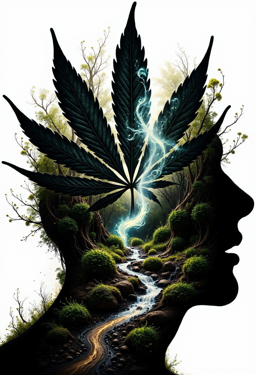 A black silhouette of a marijuana leaf filled in with depiction of a peaceful wooded trail near a stream, mists of weed smoke waft out from the silhouette. double exposure, crisp lines, double exposure background, hyperdetailed, concept art.