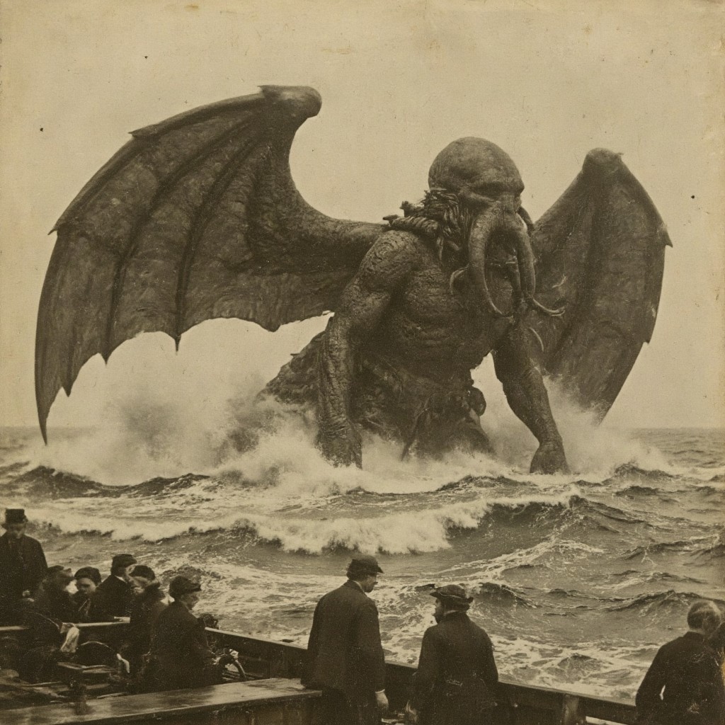 01dPh0t0 dark, shadow, distorted, grainy, film grain, Victorian, An aged worn sepia monochrome 1800s photograph of Cthulhu, large wings, tentacles, enormous, rising out of the waves of a a raging ocean, shot from the deck of a boat, horror, ominous, menacing, creepy, vast scale