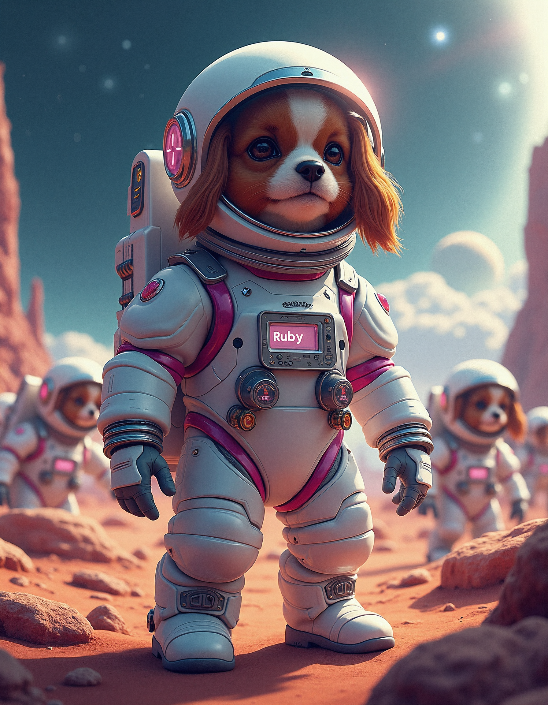 A hyper-realistic sci-fi illustration, a stunning alien landscape with rocky terrain, distant mountains, and a star-filled sky with a large, glowing planet in the distance. . A King Charles spaniel puppy wearing a sleek, futuristic space suit with a large open helmet, standing on the surface. The space suit is white with pink and silver accents, featuring various gadgets and life-support systems. The suit has a large digital readout with the name "Ruby". The dogâs expression is alert and curious. There are many clones of it in the background. The scene captures the adventurous spirit of space exploration. intricate details